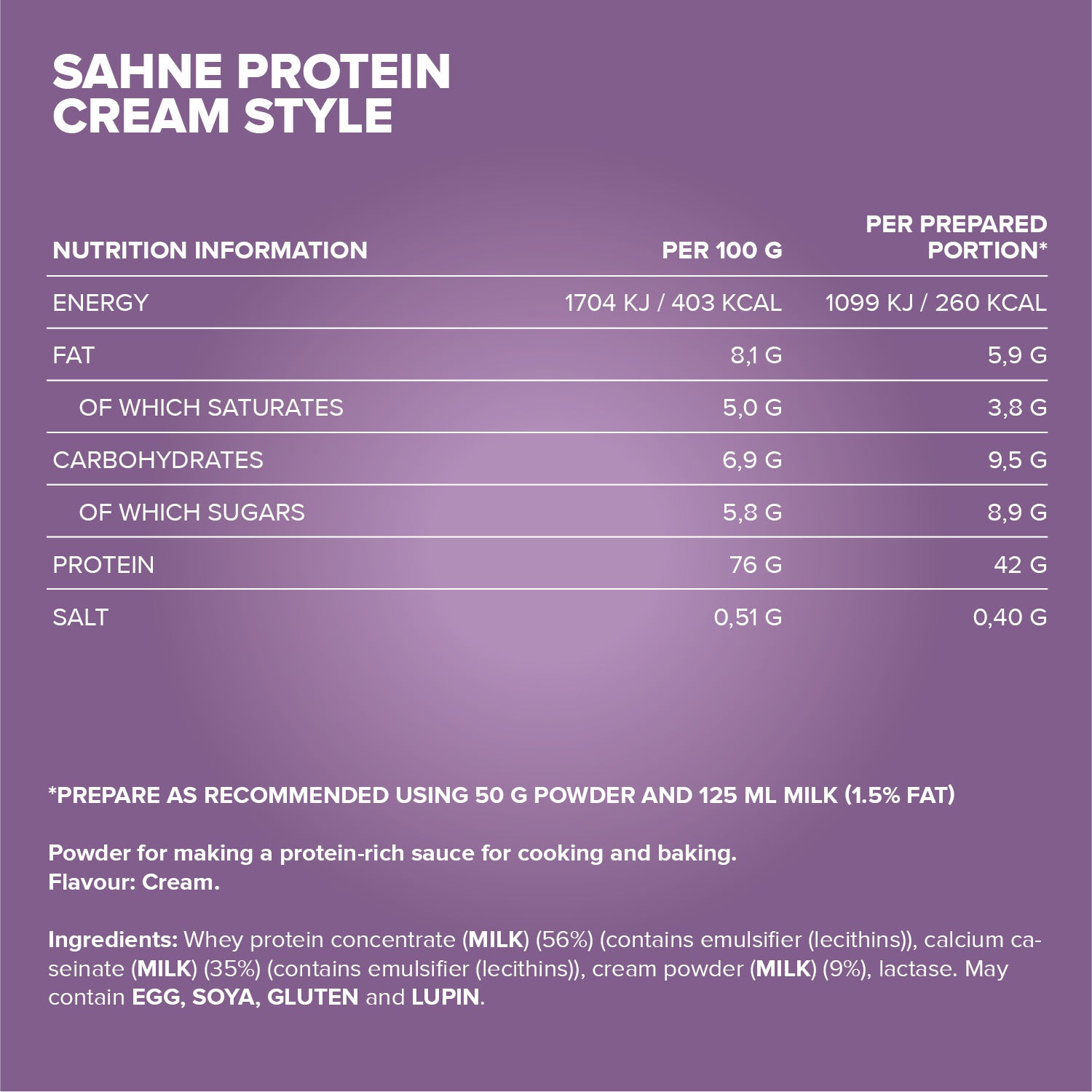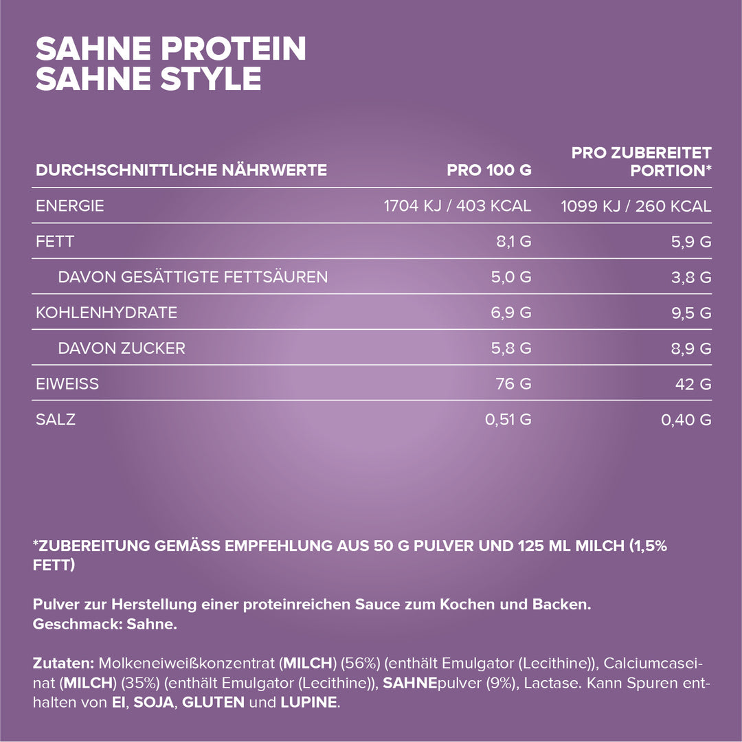 * ENTHÄLT VON NATUR AUS ZÜCKER, ** 100 g verzehrfertiges Sahne Protein* enthält 40% weniger Fett als eine herkömmliche Kochsahne mit 7% Feet.