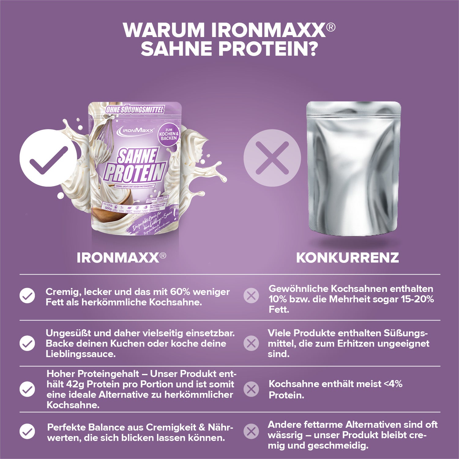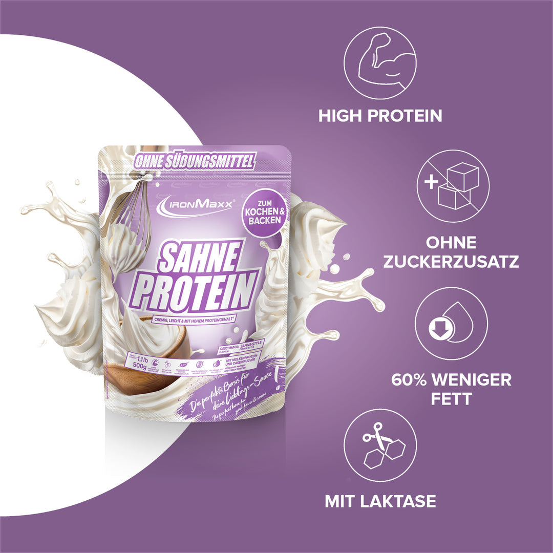 Das IronMaxx® Sahne Protein vereint cremigen Geschmack mit geballter Proteinpower – perfekt für deine Fitnessküche und eine bewusste Ernährung. Mit 76 % Eiweiß, 60 % weniger Fett und ohne Zuckerzusatz ist es die smarte Alternative zu klassischer Sahne. Einfach mit Milch anrühren, in warme Gerichte geben und genießen!