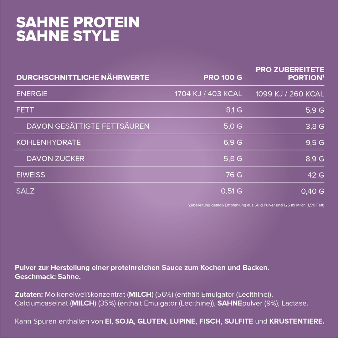 - Fettreduziert: Zubereitet enthält das Sahne Protein bis zu 60 % weniger Fett als herkömmliche Kochsahne – ideal für eine kalorienbewusste Ernährung.