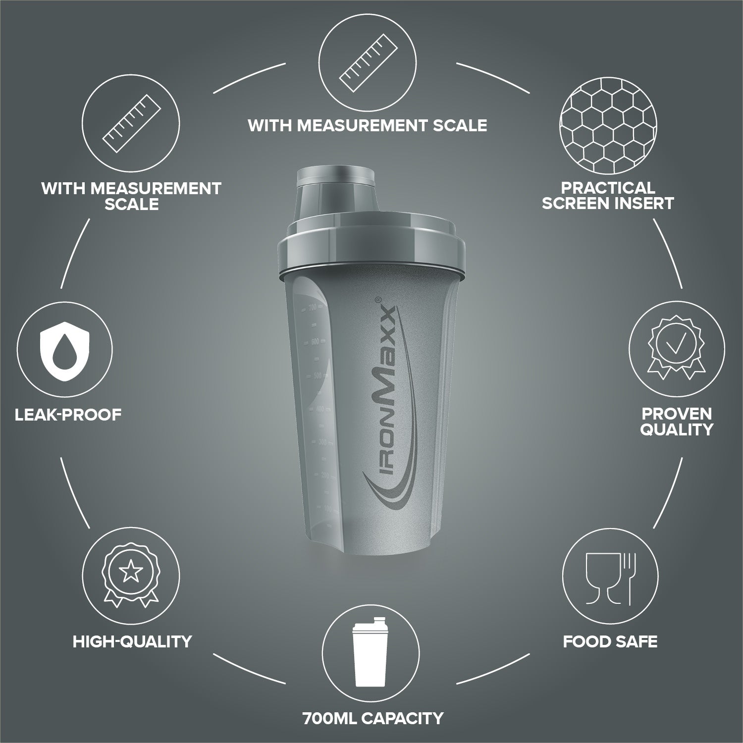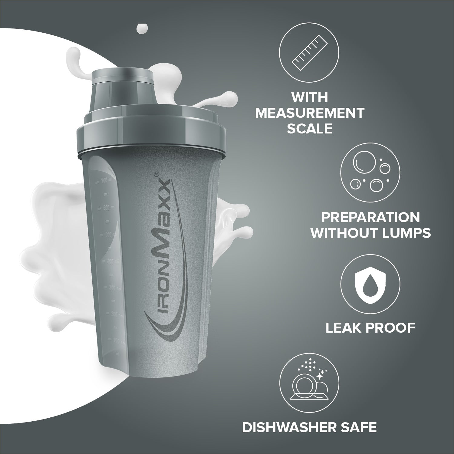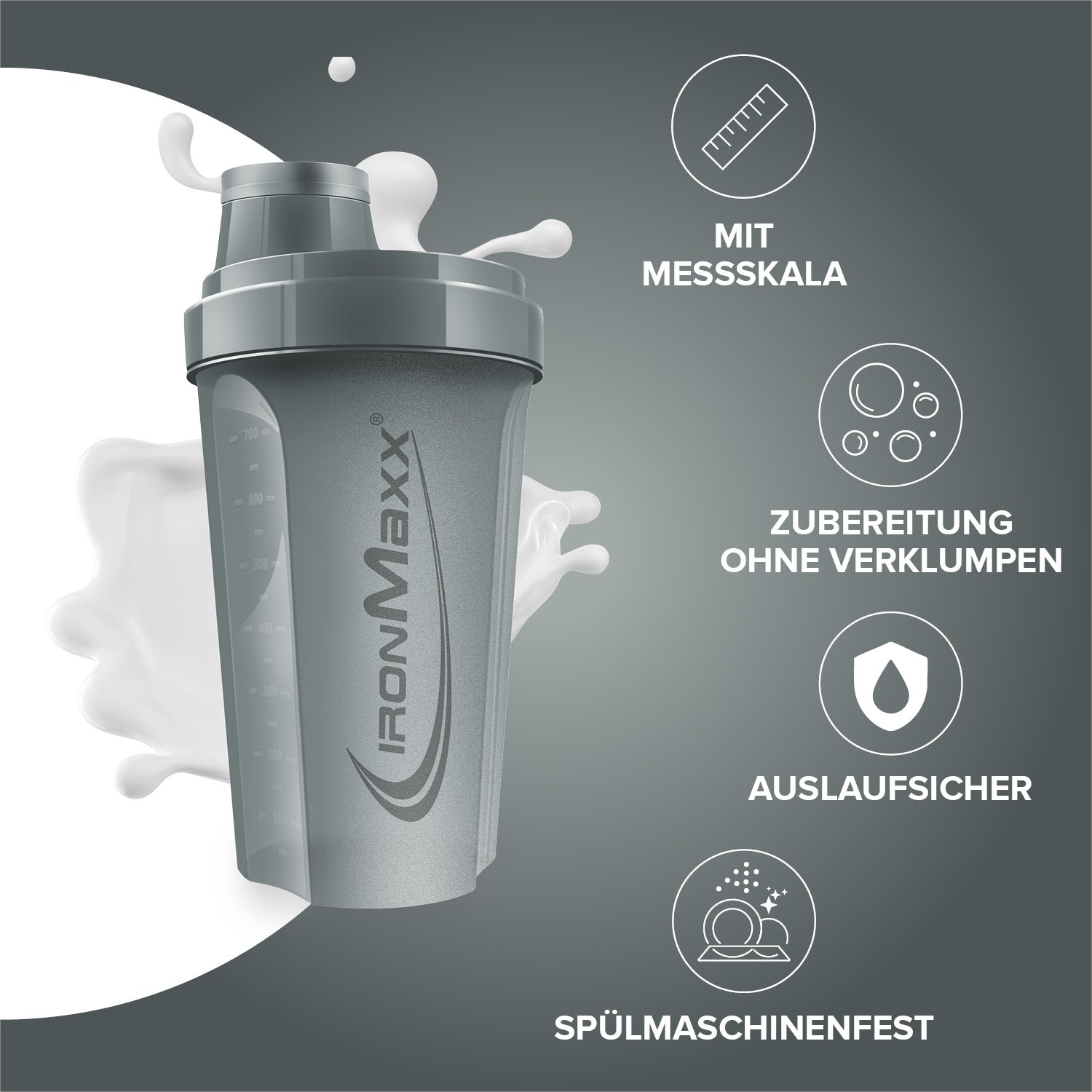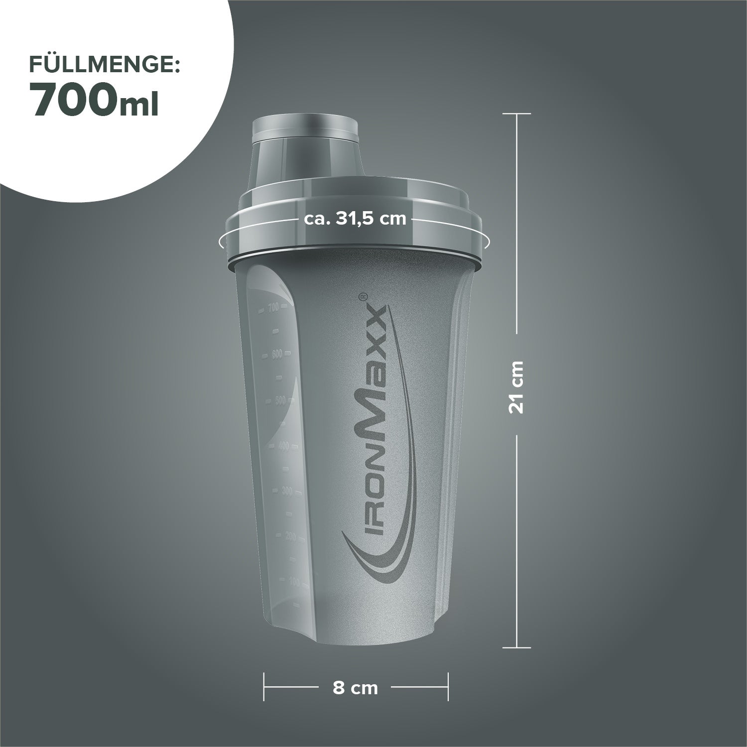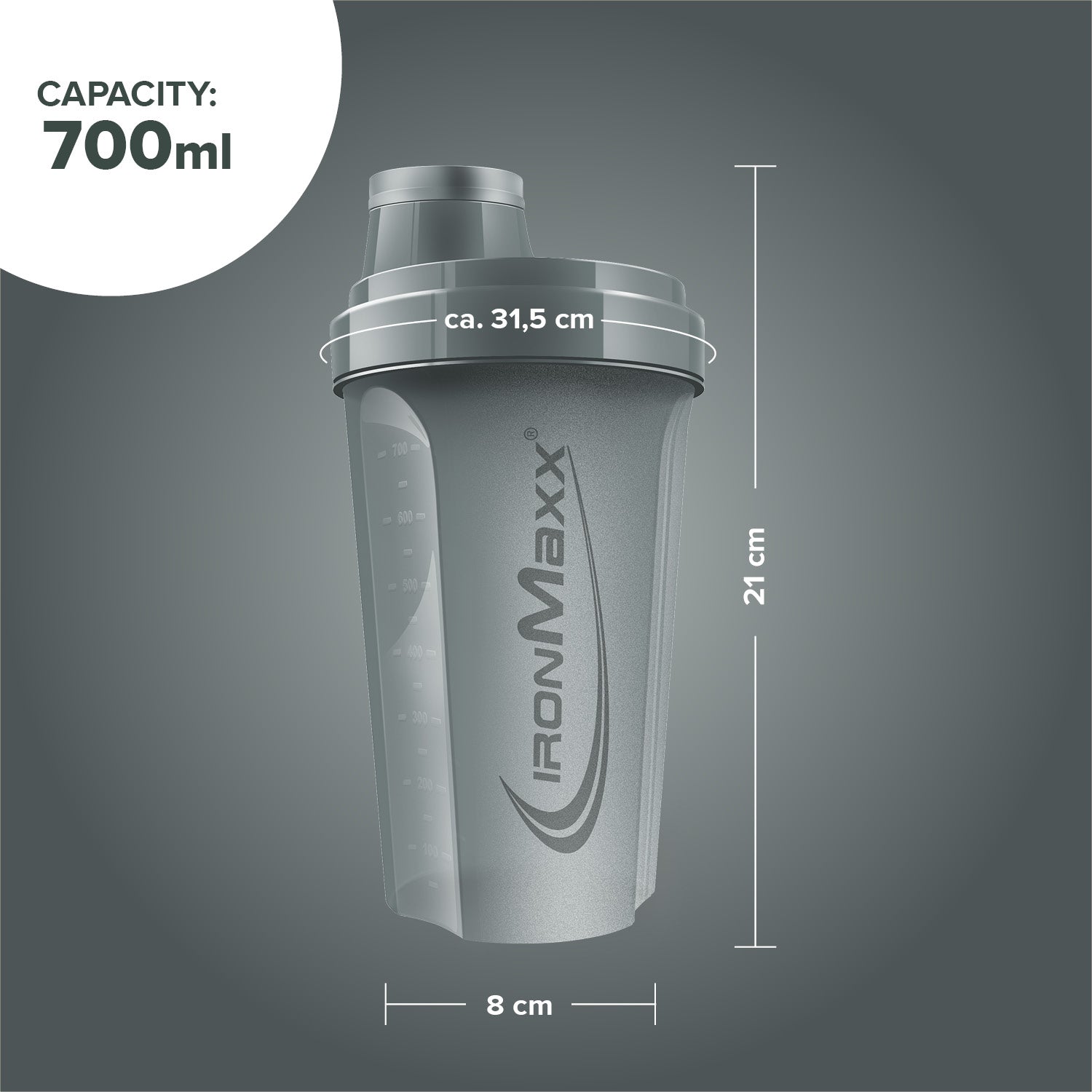 Der klassische IronMaxx® Protein Shaker ist dein verlässlicher Begleiter für cremige, klumpenfreie Shakes – überall und jederzeit. Mit einem Fassungsvermögen von 700 ml, integriertem Sieb und präziser Messskala gelingt dir jedes Mischverhältnis perfekt.