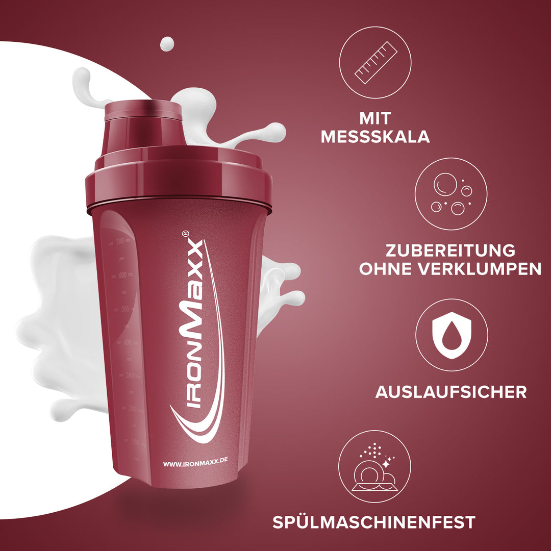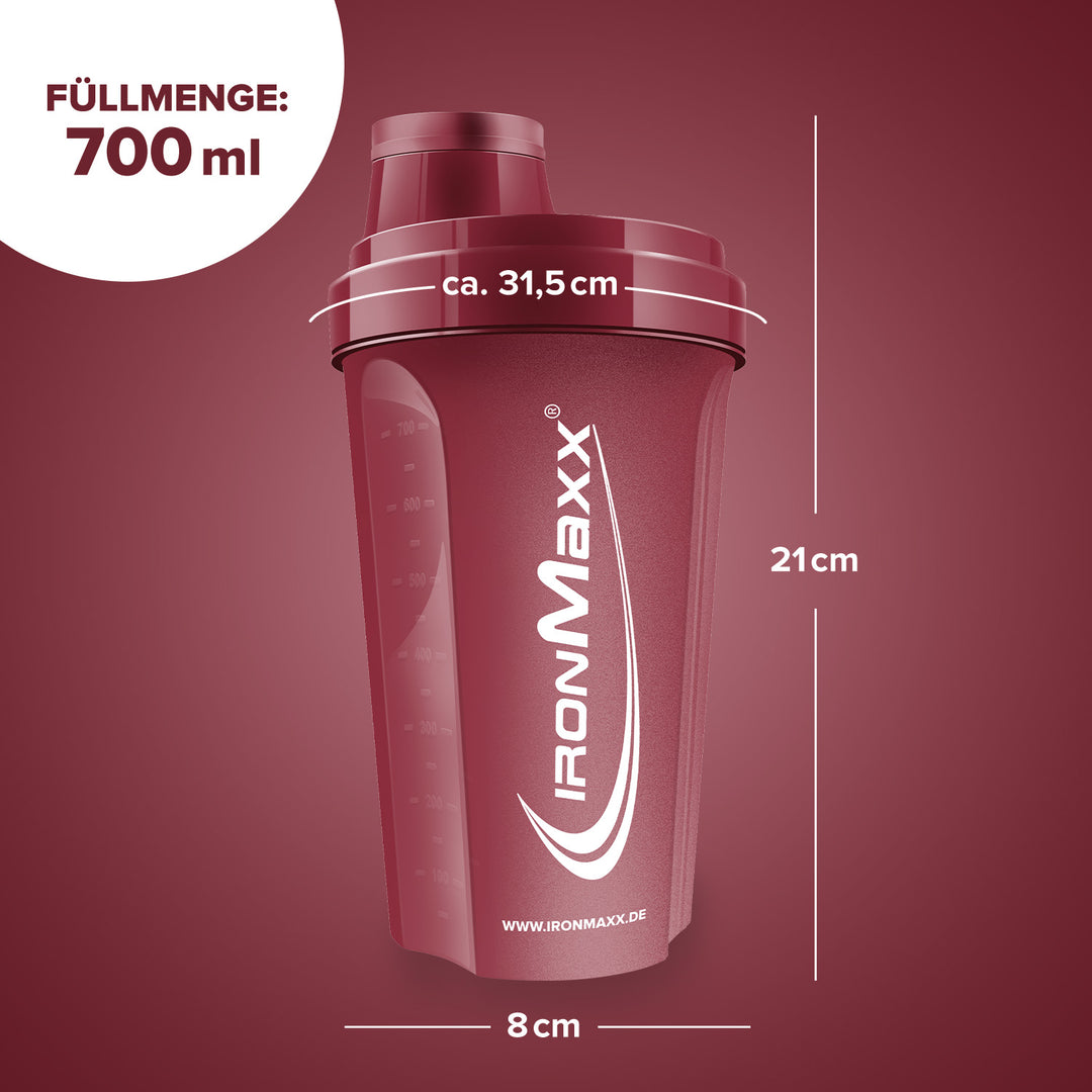 Der klassische IronMaxx® Protein Shaker ist dein verlässlicher Begleiter für cremige, klumpenfreie Shakes – überall und jederzeit. Mit einem Fassungsvermögen von 700 ml, integriertem Sieb und präziser Messskala gelingt dir jedes Mischverhältnis perfekt.
