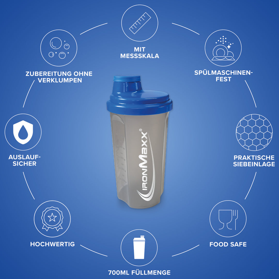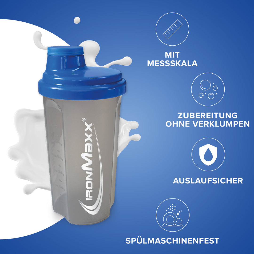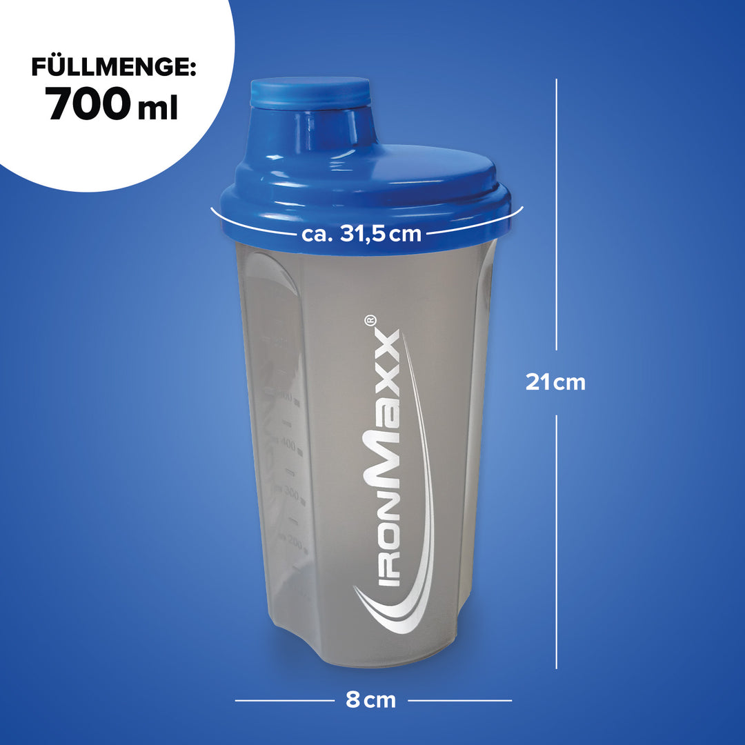 Der klassische IronMaxx® Protein Shaker ist dein verlässlicher Begleiter für cremige, klumpenfreie Shakes – überall und jederzeit. Mit einem Fassungsvermögen von 700 ml, integriertem Sieb und präziser Messskala gelingt dir jedes Mischverhältnis perfekt.