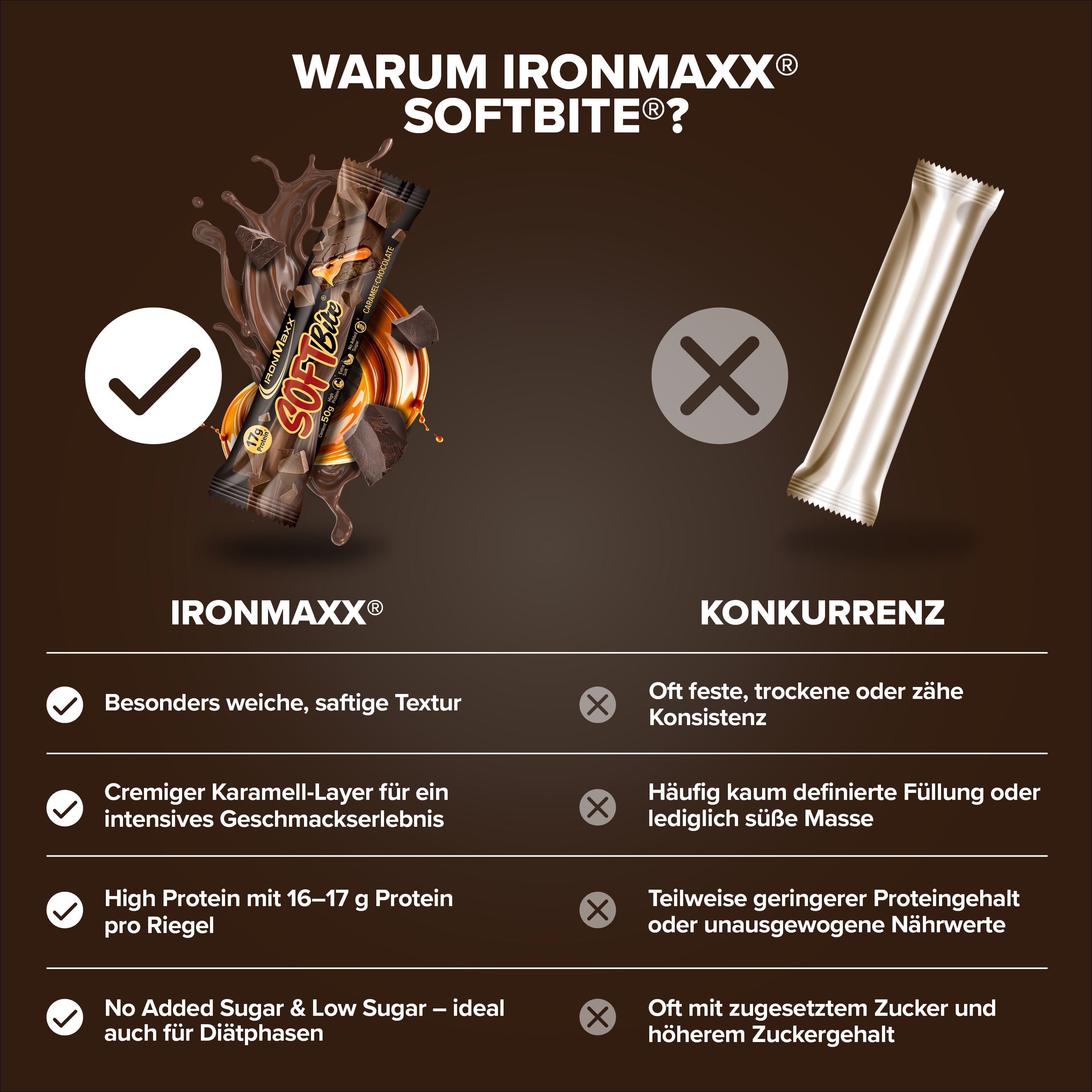 IronMaxx® Softbite ist ein softer Proteinriegel mit intensivem Peanut-Caramel-Geschmack – ideal für alle, die Genuss und Funktionalität verbinden möchten. Die weiche Konsistenz, kombiniert mit cremigem Karamell und feinen Erdnussnoten, macht den Softbite zu einem echten Snack-Highlight im Alltag.