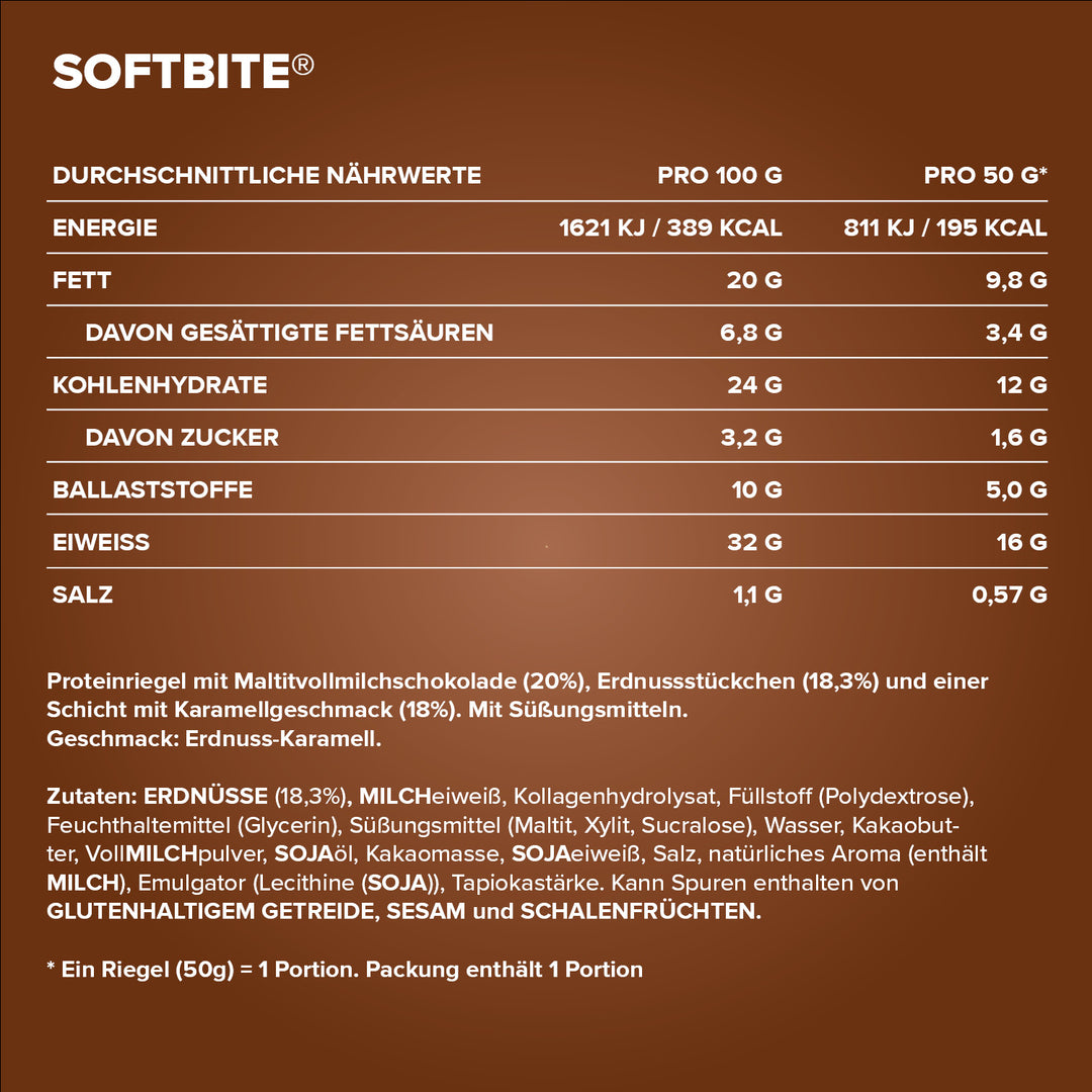 - Soft & crunchy zugleich: Weicher Proteinriegel mit knackigen Erdnussstückchen und feiner Karamellnote für echten Genuss.