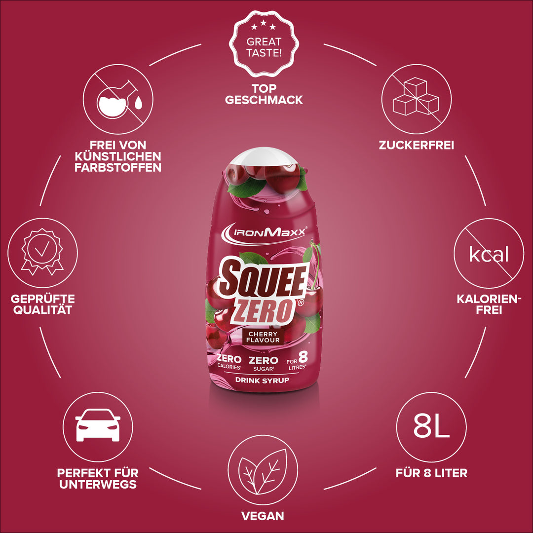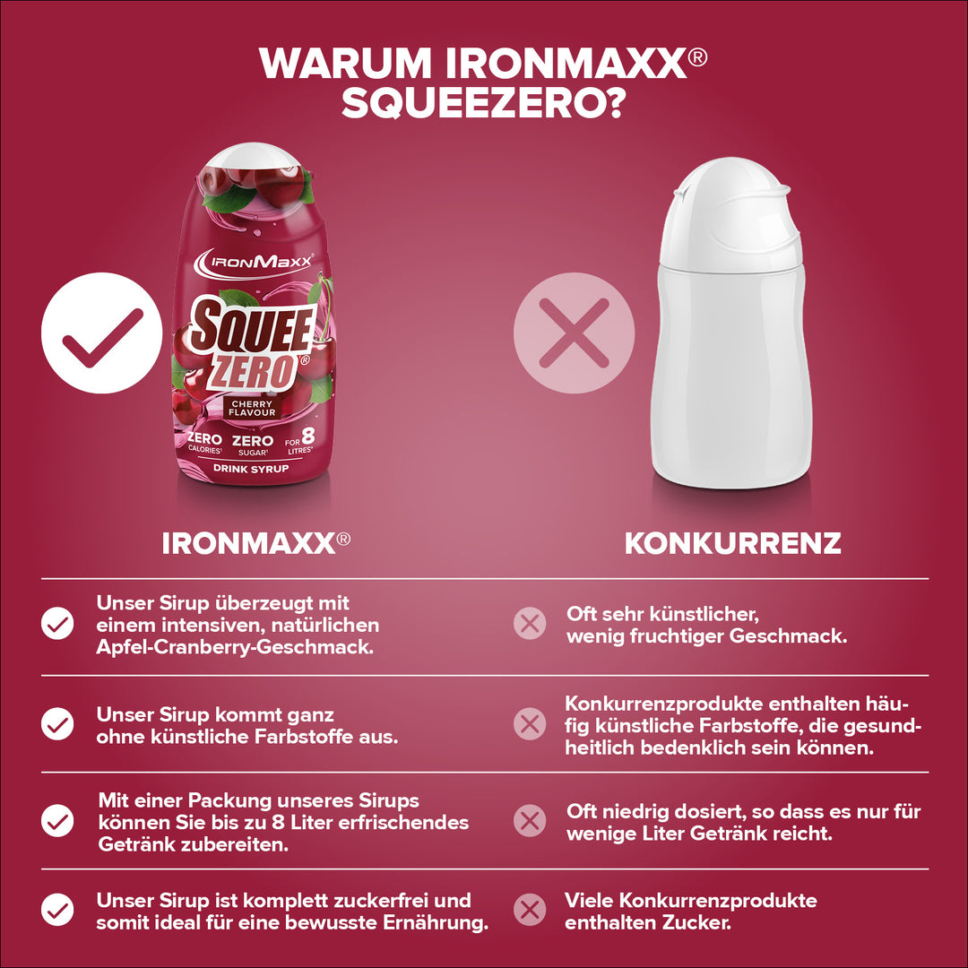 IronMaxx® SqueeZero – das zuckerfreie & kalorienfreie Getränkekonzentrat für mehr Geschmack im Alltag. Mit nur wenigen Tropfen verwandelst du Wasser in ein erfrischendes Fitness-Getränk – ganz ohne Zucker und Kalorien. Jede Flasche (65 ml) ergibt bis zu 8 Liter fertiges Getränk und sorgt dafür, dass du motiviert bleibst, mehr zu trinken.