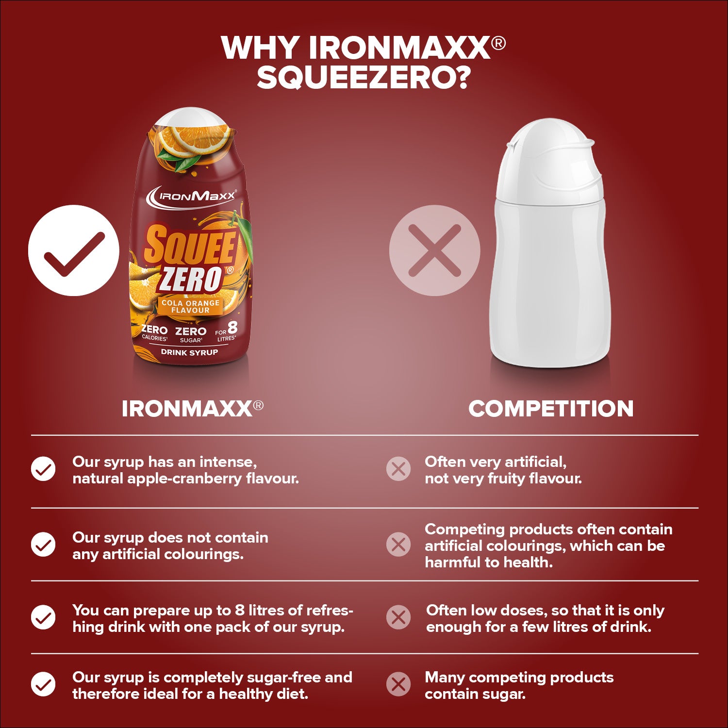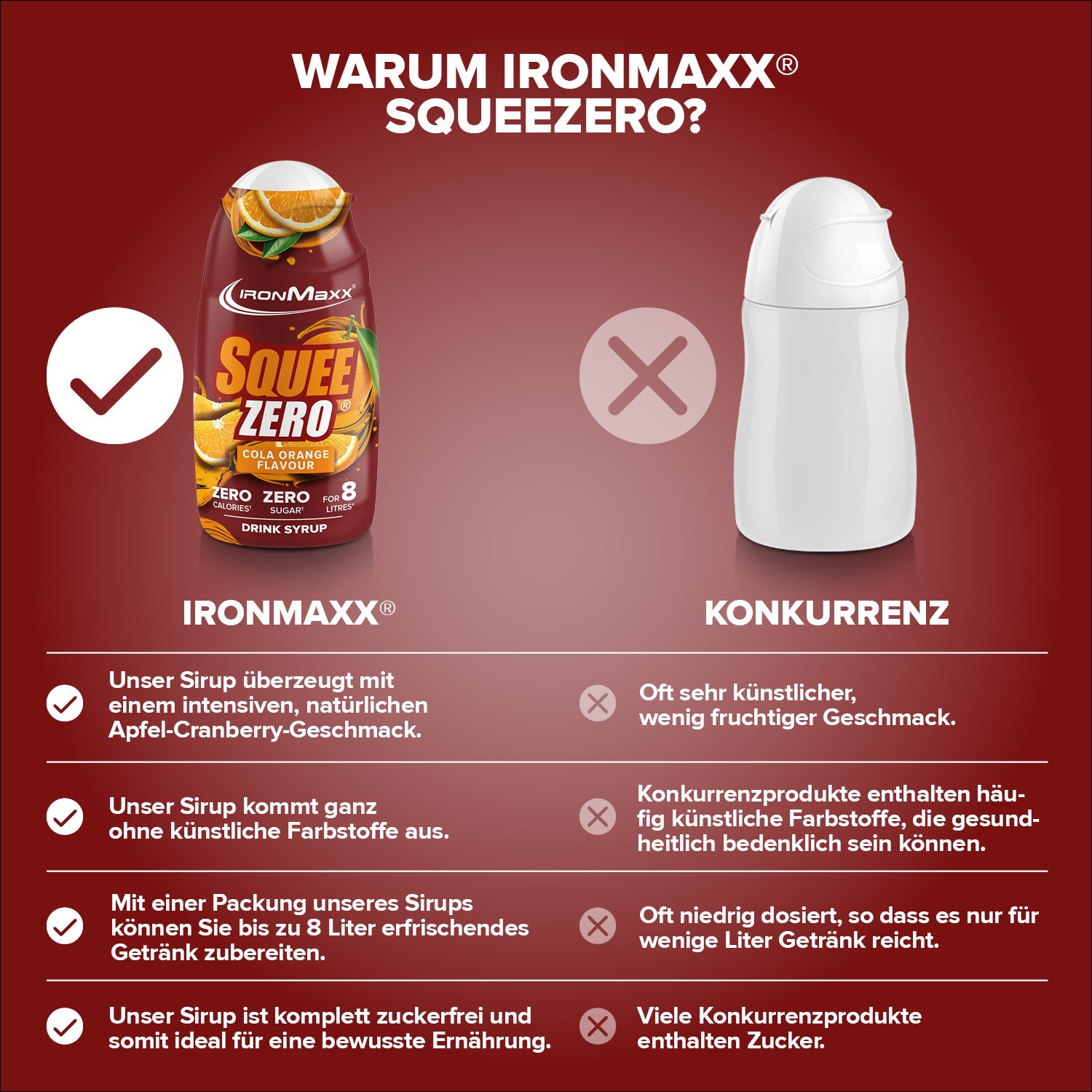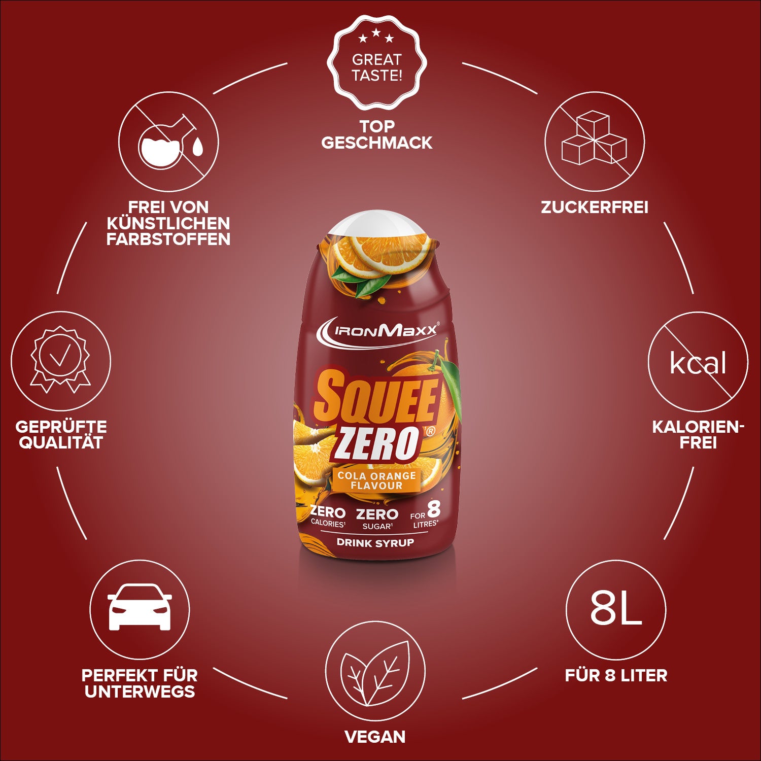 IronMaxx® SqueeZero – das zuckerfreie & kalorienfreie Getränkekonzentrat für mehr Geschmack im Alltag. Mit nur wenigen Tropfen verwandelst du Wasser in ein erfrischendes Fitness-Getränk – ganz ohne Zucker und Kalorien. Jede Flasche (65 ml) ergibt bis zu 8 Liter fertiges Getränk und sorgt dafür, dass du motiviert bleibst, mehr zu trinken.