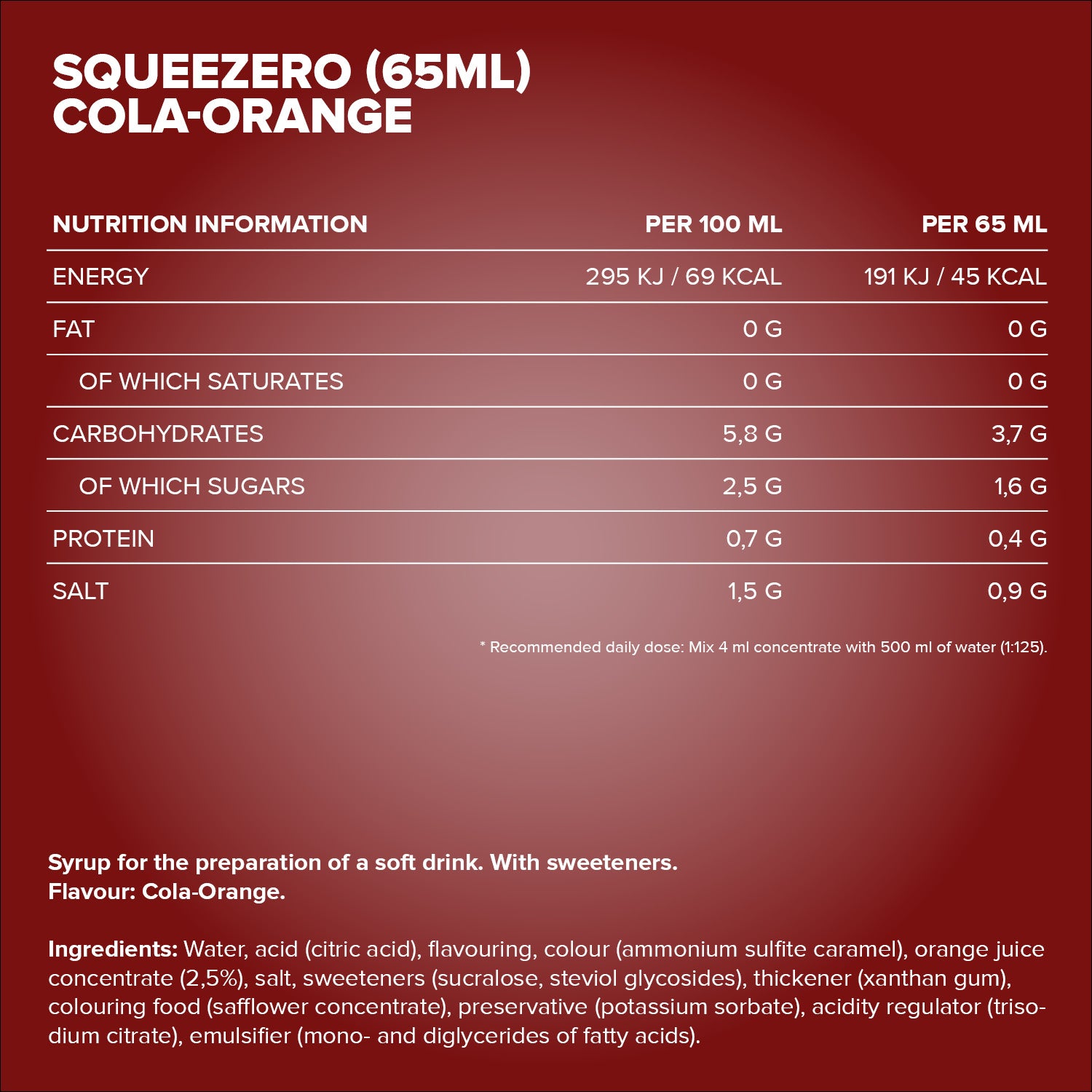 Wasser, Säuerungsmittel (Citronensäure), Aroma, Farbstoff (Ammoniumsulfit-Zuckerkulör), Orangensaftkonzentrat (2,5%), Salz, Süßungsmittel (Sucralose, Steviolglycoside aus Stevia), Verdickungsmittel (Xanthan), färbendes Lebensmittel (Saflorkonzentrat), Konservierungsstoff (Kaliumsorbat), Säureregulator (Natriumcitrat), Emulgator (Mono- und Diglyceride von Speisefettsäuren).