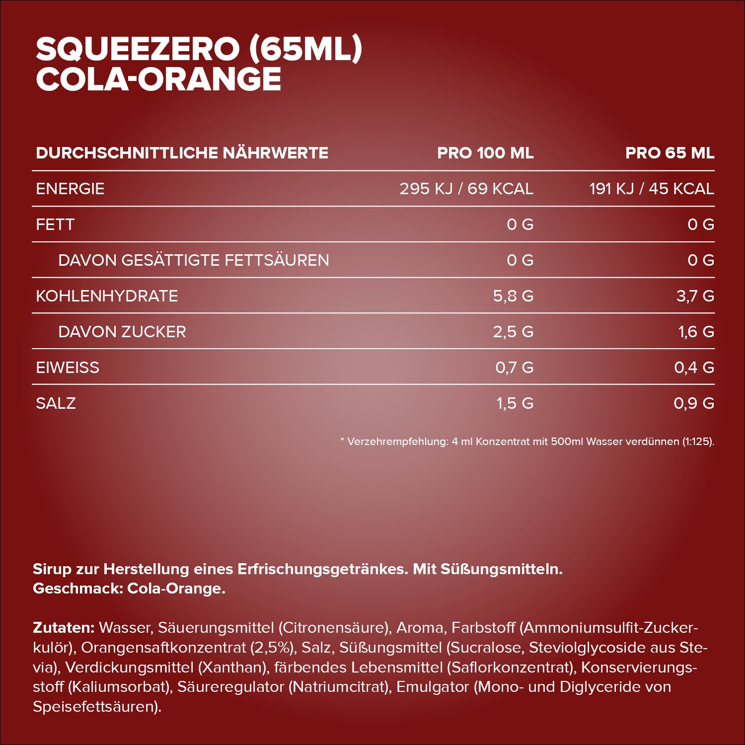 Verkehrsbezeichnung: Sirup zur Herstellung eines Erfrischungsgetränkes. Mit Süßungsmitteln.