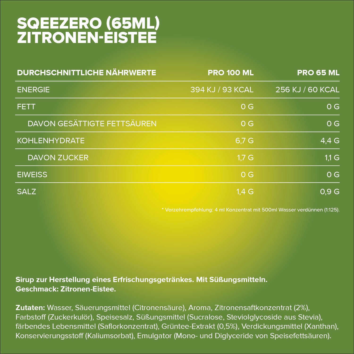 Wasser, Säuerungsmittel (Citronensäure), Aroma, Zitronensaftkonzentrat (2%), Farbstoff (Zuckerkulör), Speisesalz, Süßungsmittel (Sucralose, Steviolglycoside aus Stevia), färbendes Lebensmittel (Saflorkonzentrat), Grüntee-Extrakt (0,5%), Verdickungsmittel (Xanthan), Konservierungsstoff (Kaliumsorbat), Emulgator (Mono- und Diglyceride von Speisefettsäuren).