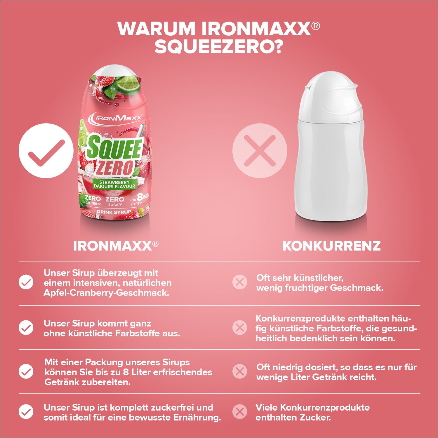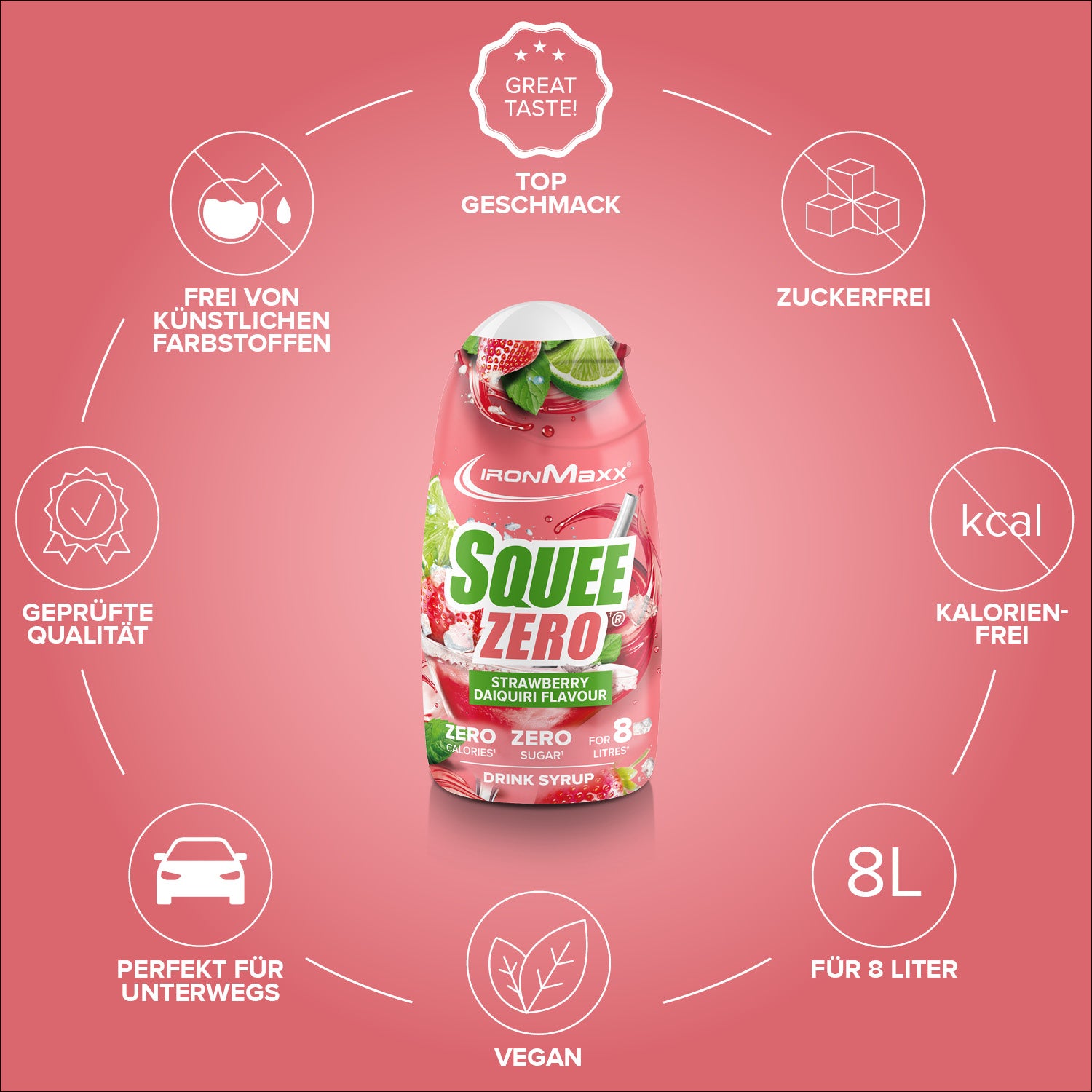 IronMaxx® SqueeZero – das zuckerfreie & kalorienfreie Getränkekonzentrat für mehr Geschmack im Alltag. Mit nur wenigen Tropfen verwandelst du Wasser in ein erfrischendes Fitness-Getränk – ganz ohne Zucker und Kalorien. Jede Flasche (65 ml) ergibt bis zu 8 Liter fertiges Getränk und sorgt dafür, dass du motiviert bleibst, mehr zu trinken.
