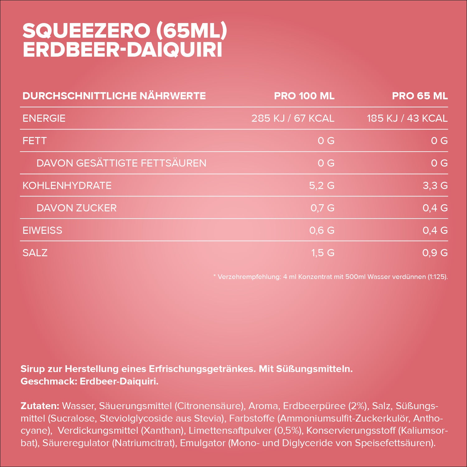 Wasser, Säuerungsmittel (Citronensäure), Aroma, Erdbeerpüree (2%), Salz, Süßungsmittel (Sucralose, Steviolglycoside aus Stevia), Farbstoffe (Ammoniumsulfit-Zuckerkulör, Anthocyane), Verdickungsmittel (Xanthan), Limettensaftpulver (0,5%), Konservierungsstoff (Kaliumsorbat), Süßungsmittel (Natriumsaccharin), Emulgator (Mono- und Diglyceride von Speisefettsäuren).