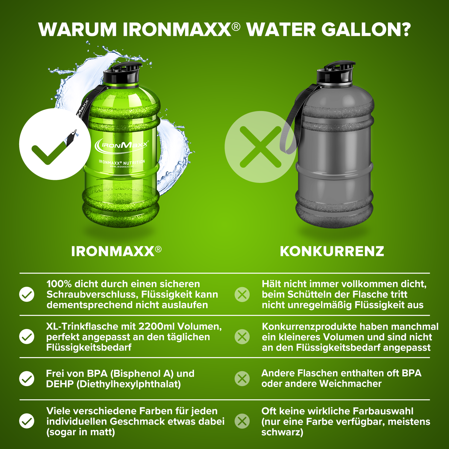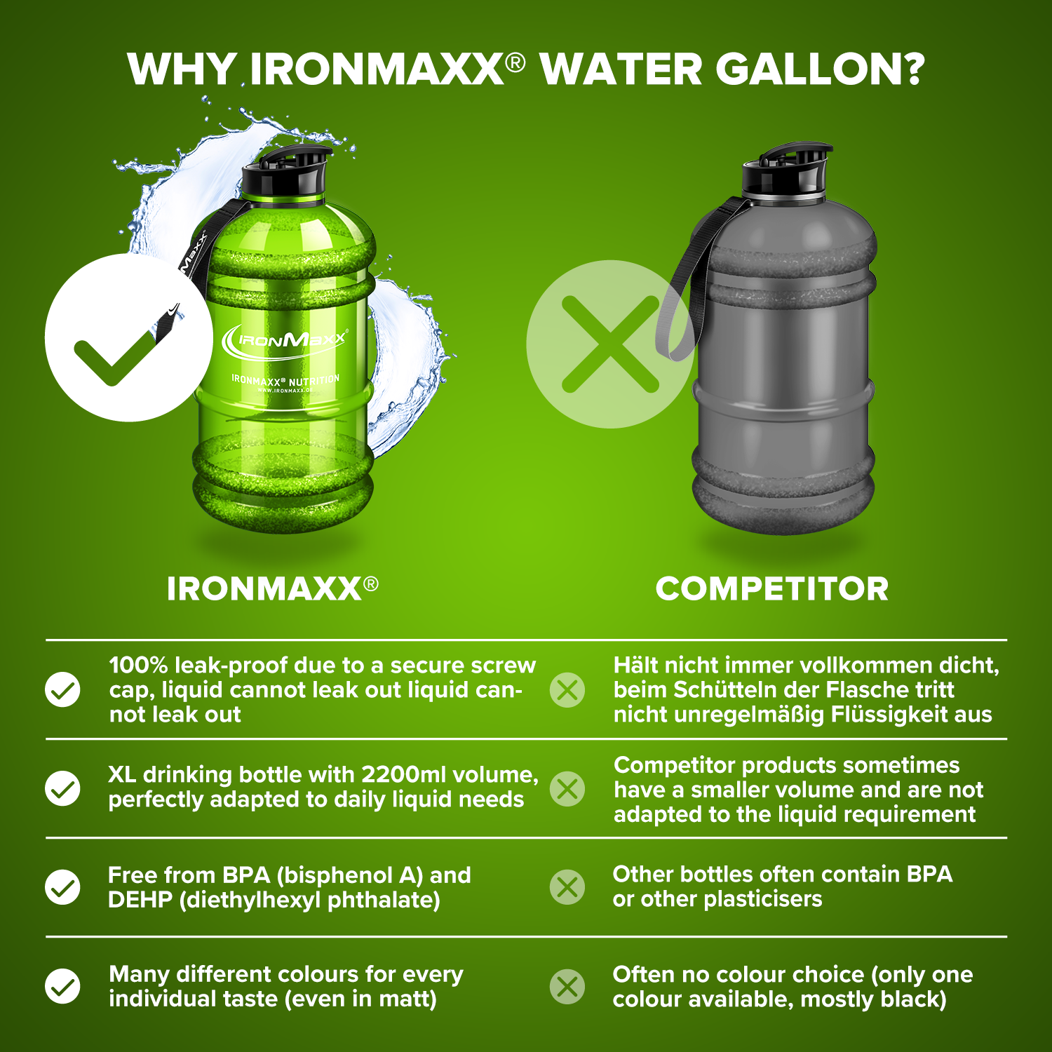 - Dein Hydration-Booster: Die Water Gallon von IronMaxx® ist der perfekte Motivator, um ausreichend Flüssigkeit zu trinken – ob beim Training oder im Alltag.