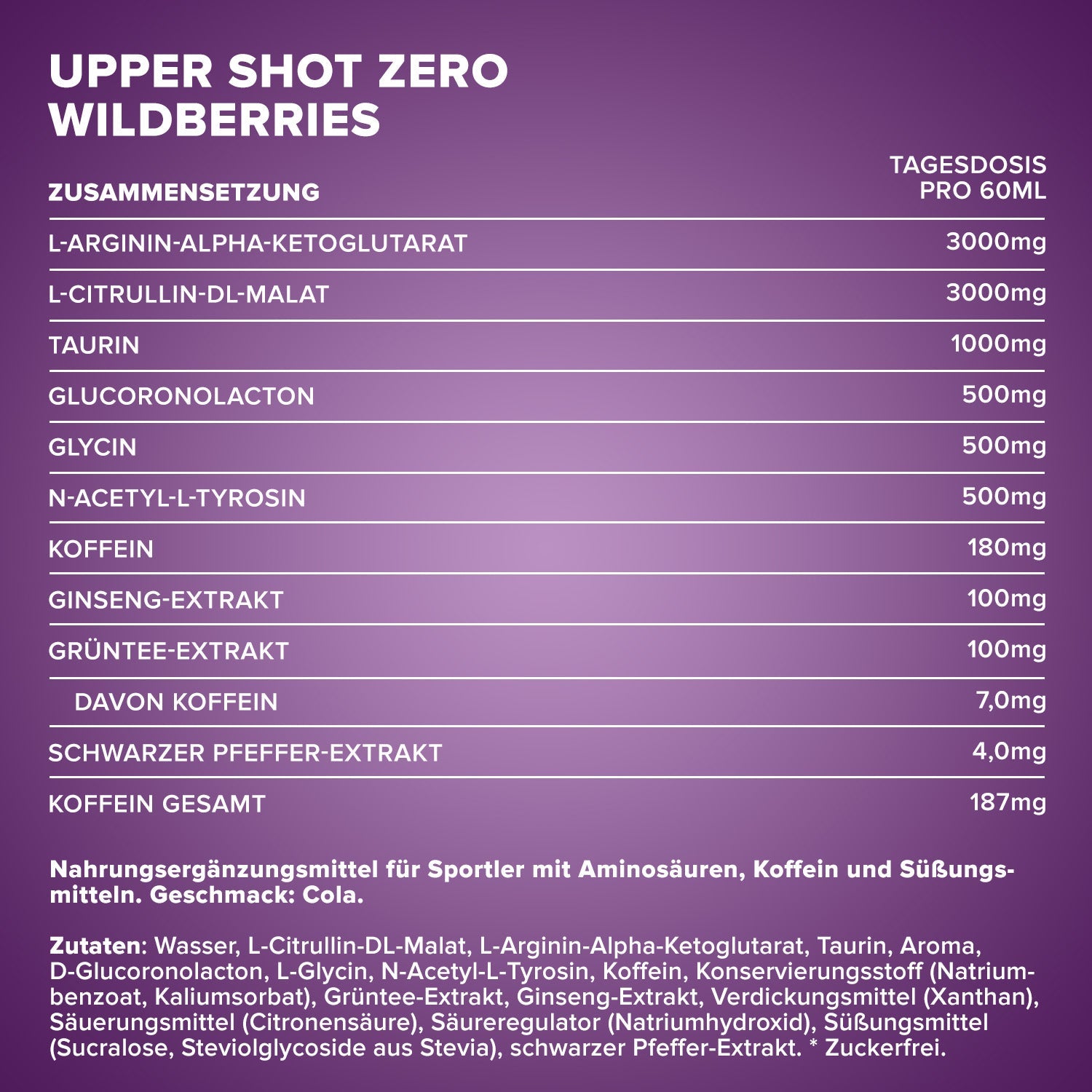 Hinweis: Die angegebene empfohlene tägliche Verzehrmenge darf nicht überschritten werden! Nicht als Ersatz für eine ausgewogene und abwechslungsreiche Ernährung sowie gesunde Lebensweise verwenden! Außerhalb der Reichweite von kleinen Kindern lagern! Vor Wärme, Feuchtigkeit und Sonneneinstrahlung geschützt aufbewahren. Enthält Koffein. Für Kinder und schwangere Frauen nicht empfohlen (187 mg/60 ml).