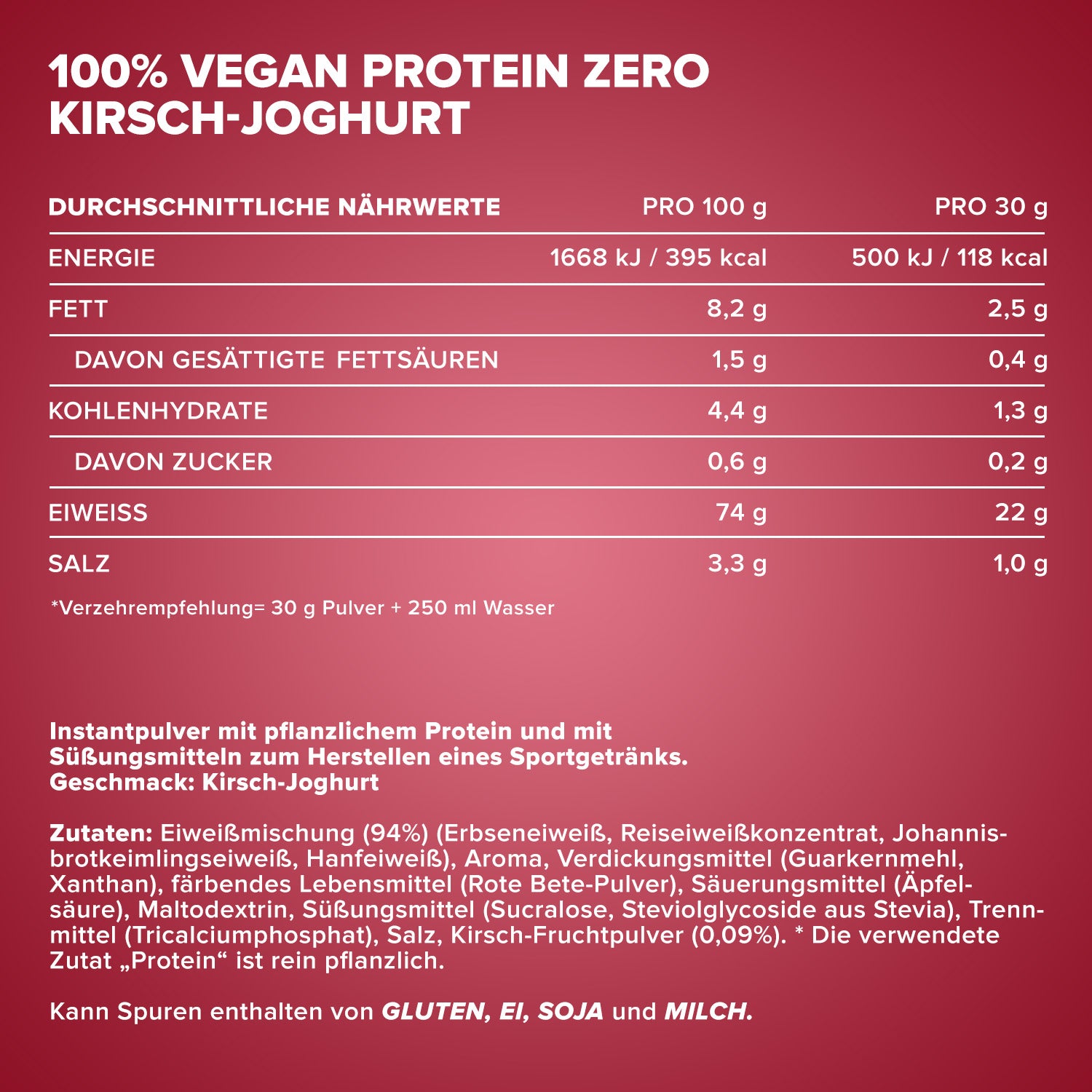 Eiweißmischung (93%) (Erbseneiweiß, Reiseiweißkonzentrat, Johannisbrotkeimlingseiweiß, Hanfeiweiß), Aroma, Verdickungsmittel (Guarkernmehl, Xanthan), Rote Beete Pulver*, Säuerungsmittel (Äpfelsäure), Maltodextrin, Süßungsmittel (Sucralose, Stevioglycoside), Trennmittel (Tricalciumphosphat), Salz, Kirsch-Fruchtpulver (0,09%).