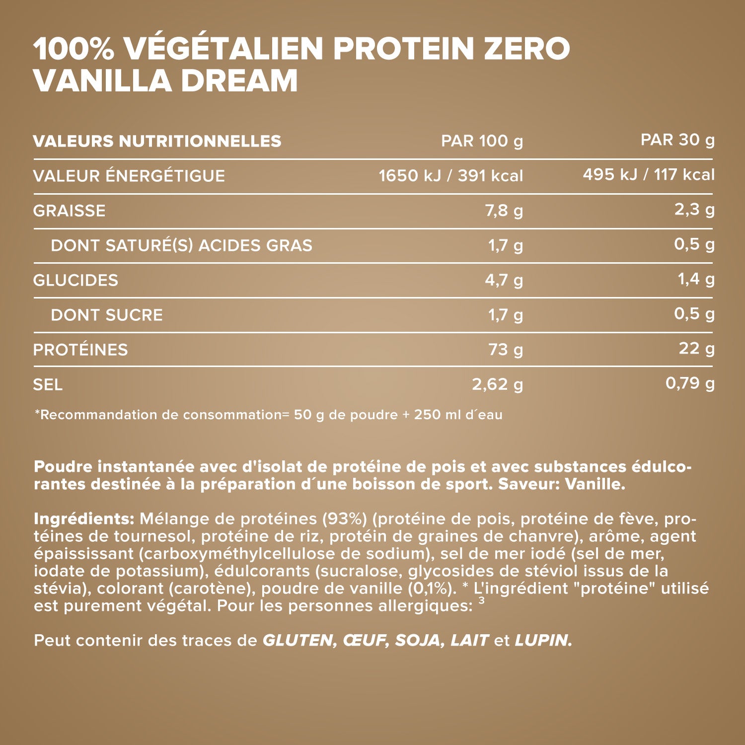 Eiweißmischung (91%) (Erbseneiweißisolat, Reiseiweißkonzentrat, Johannisbrotkeimlingseiweiß, Hanfeiweiß), Aroma, Verdickungsmittel (Guarkernmehl, Xanthan), Meersalz*, Süßungsmittel (Sucralose, Steviolglycoside), Trennmittel (Tricalciumphosphat), Vanilleschotenpulver (0,1%), Farbstoff (Carotin).