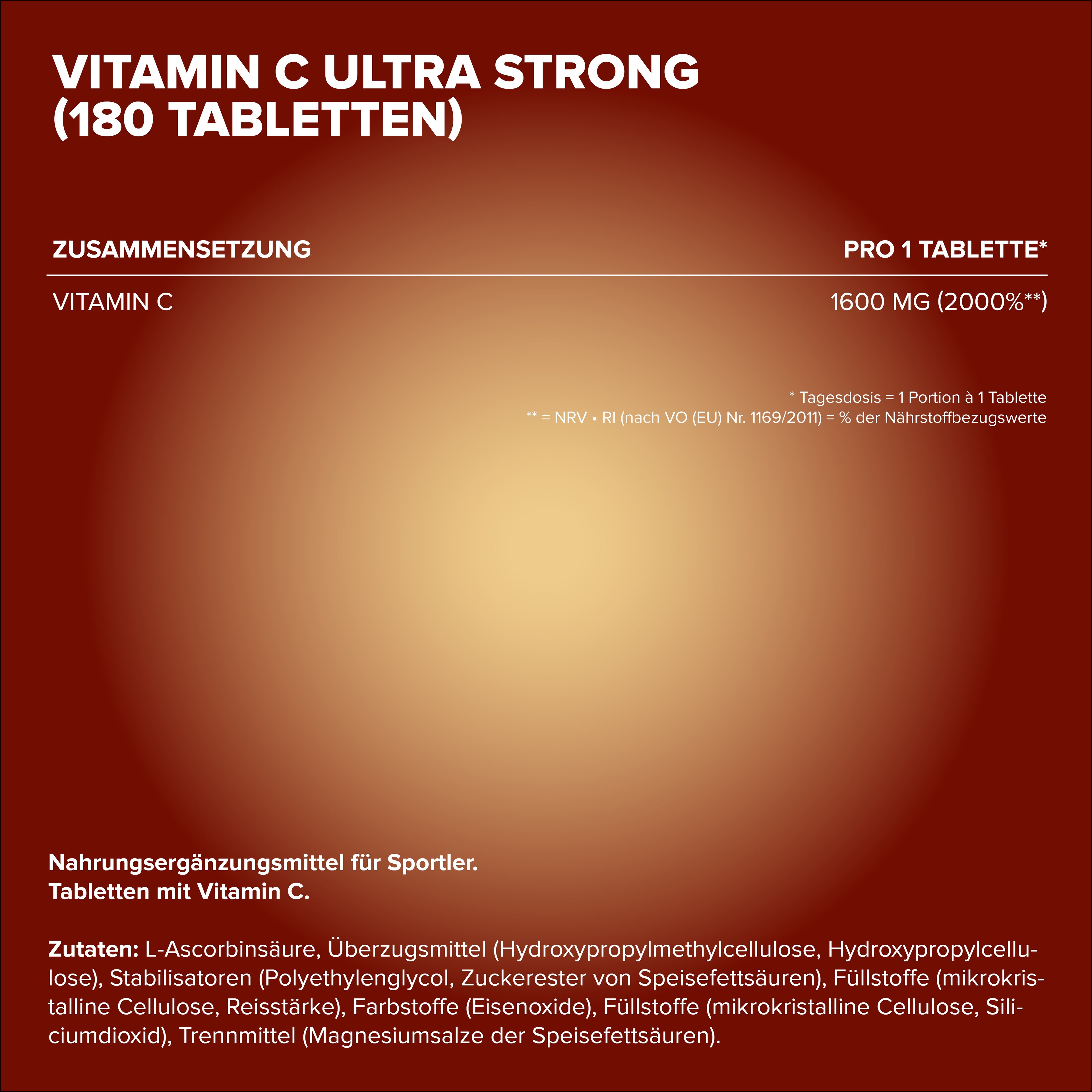L-Ascorbinsaure, Uberzugsmittel (Hydroxypropylmethyl- cellulose, Hydroxypropylcellulose), Stabilisatoren (Polyethylenglycol, Zuckerester von Speise- fettsauren), Fullstoffe (mikrokristalline Cellulose, Reisstarke), Farbstoffe (Eisenoxide), Fullstoffe (mikrokristalline Cellulose, Siliciumdioxid), Trennmittel (Magnesiumsalze der Speisefettsauren). Kann Spuren enthalten von KREBSTIEREN, EI, FISCH, SOJA, MILCH, SCHA- LENFRUCHTEN, LUPINEN, SCHWEFELDIOXID und SULFITEN.