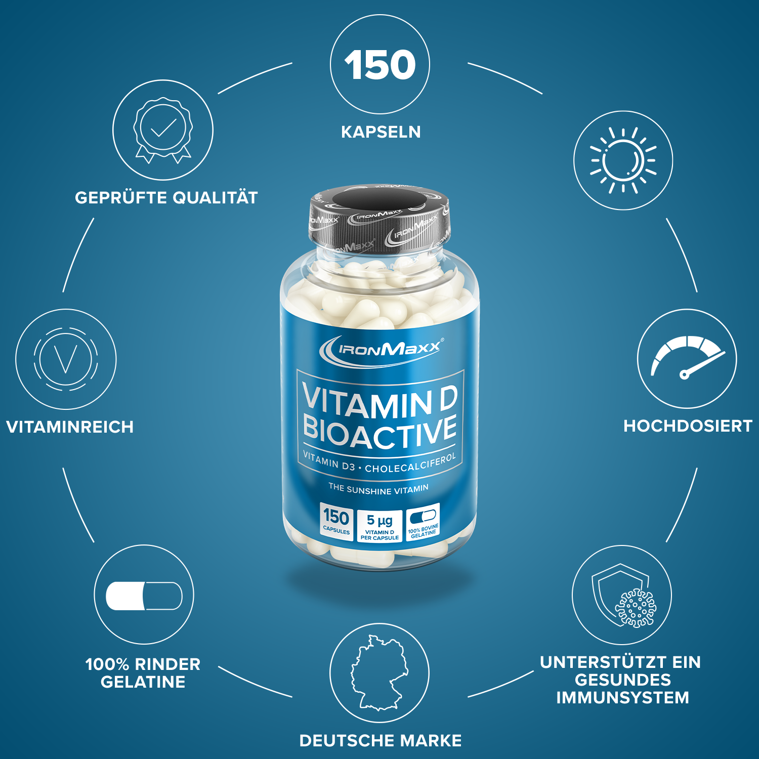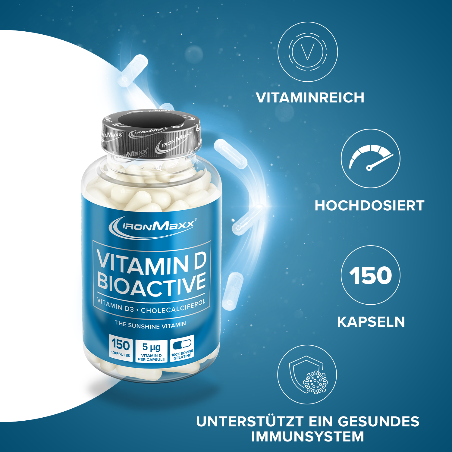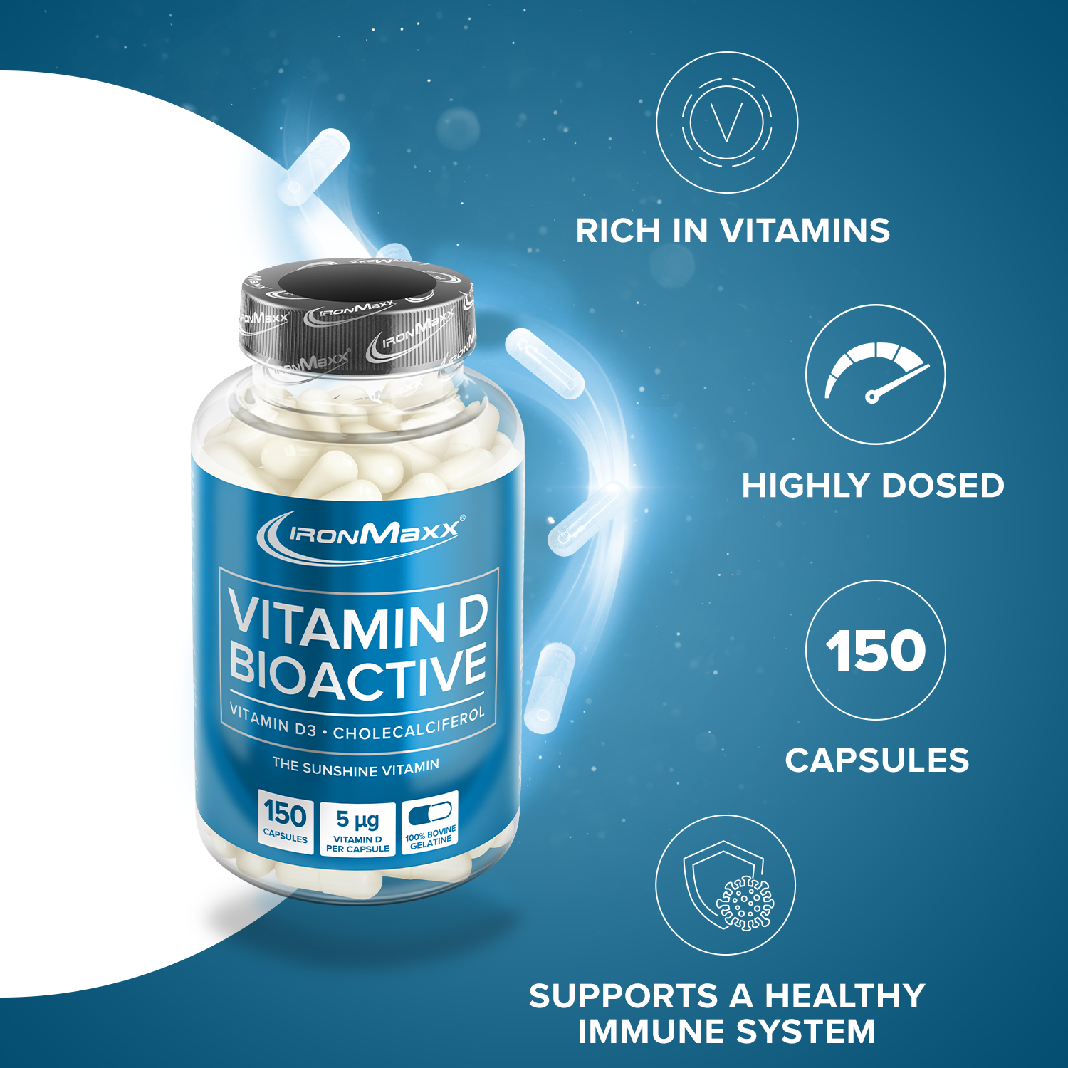 Vitamin D Bioactive von IronMaxx® versorgt dich mit hochdosiertem Vitamin D3 (Cholecalciferol) in besonders bioverfügbarer Form – für maximale Aufnahme durch deinen Körper. Gerade bei Sportlern kann der Bedarf an Mikronährstoffen erhöht sein, da über das Schwitzen viele wichtige Substanzen verloren gehen. Eine einzige Kapsel täglich genügt, um 100 % der empfohlenen Tagesdosis (NRV)* abzudecken – ideal zur Unterstützung der Knochen, Muskelfunktion, Zellteilung und Abwehrkräfte.