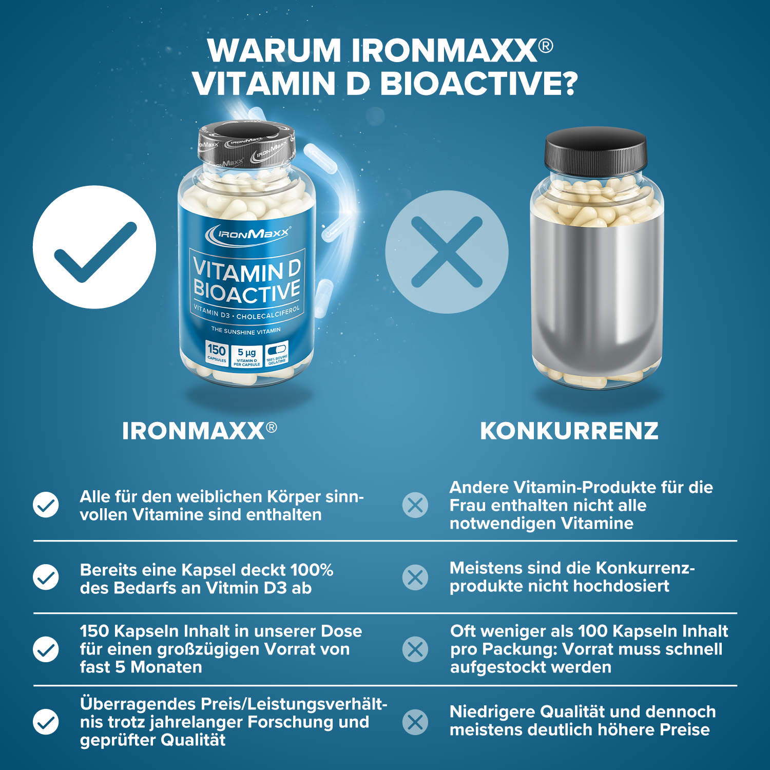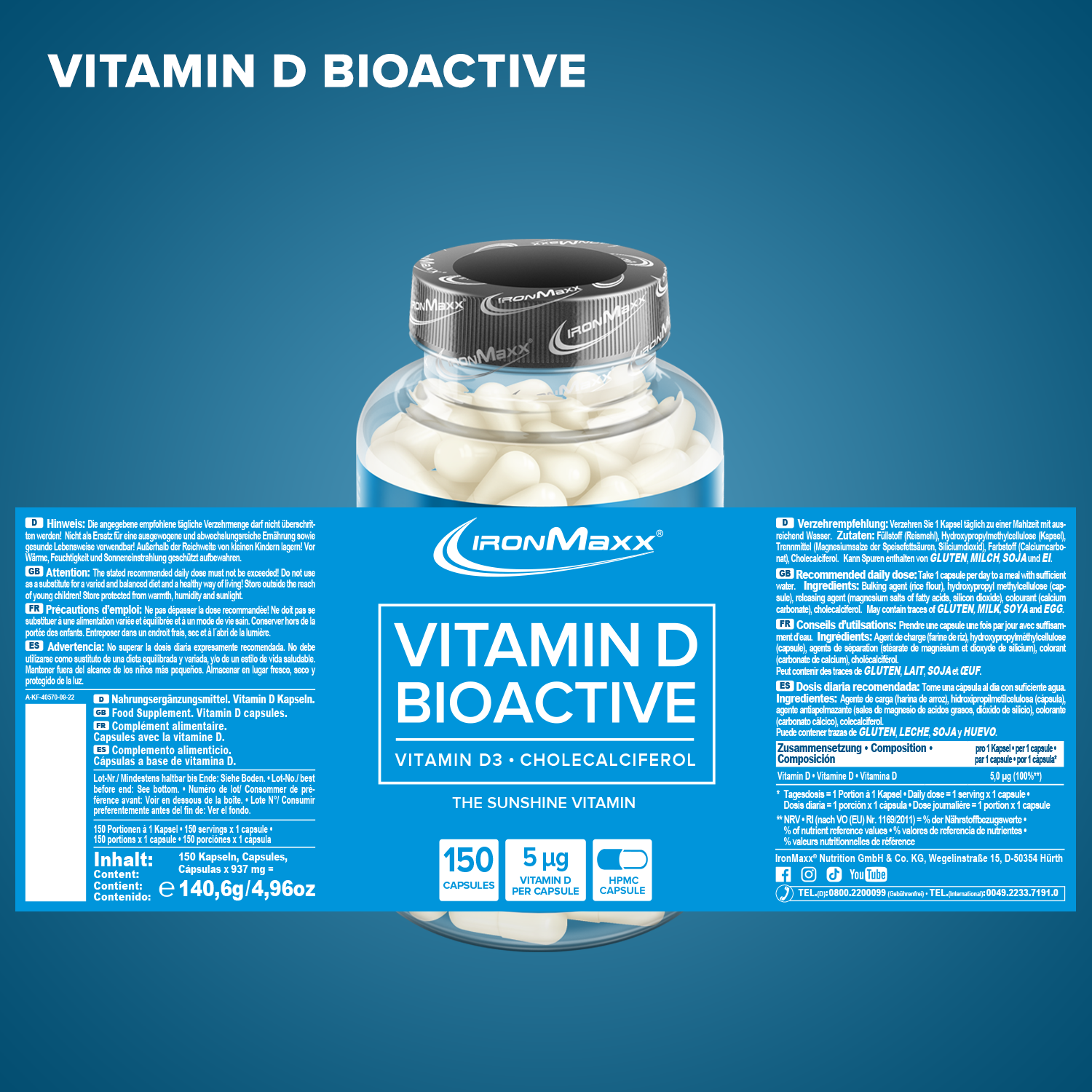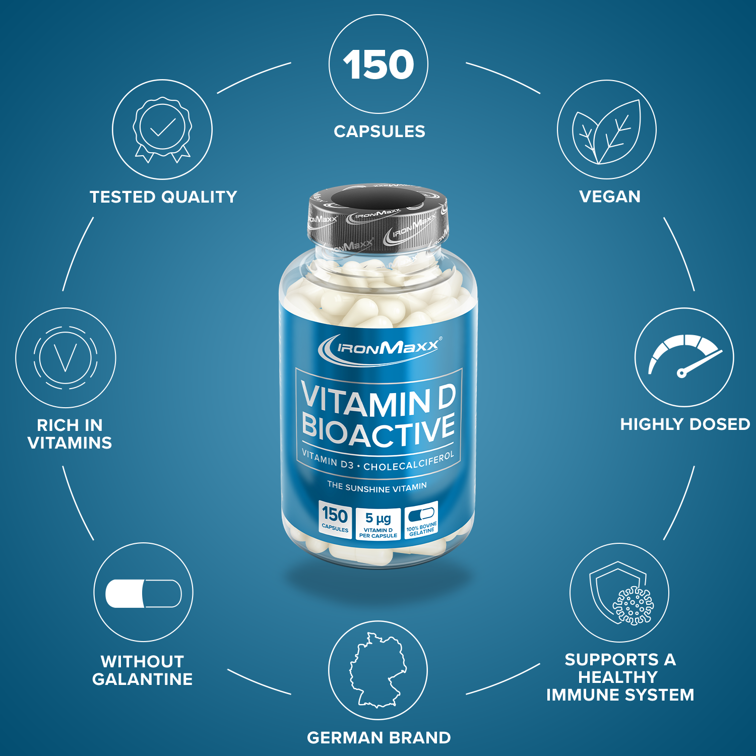 Vitamin D Bioactive von IronMaxx® versorgt dich mit hochdosiertem Vitamin D3 (Cholecalciferol) in besonders bioverfügbarer Form – für maximale Aufnahme durch deinen Körper. Gerade bei Sportlern kann der Bedarf an Mikronährstoffen erhöht sein, da über das Schwitzen viele wichtige Substanzen verloren gehen. Eine einzige Kapsel täglich genügt, um 100 % der empfohlenen Tagesdosis (NRV)* abzudecken – ideal zur Unterstützung der Knochen, Muskelfunktion, Zellteilung und Abwehrkräfte.