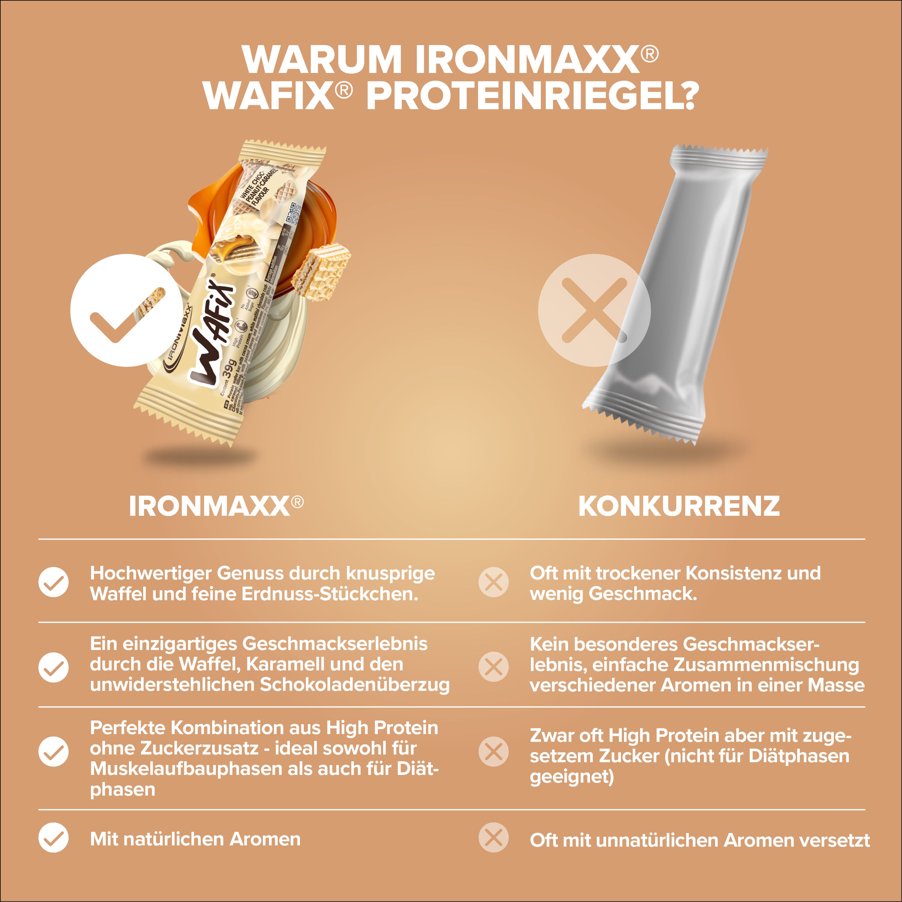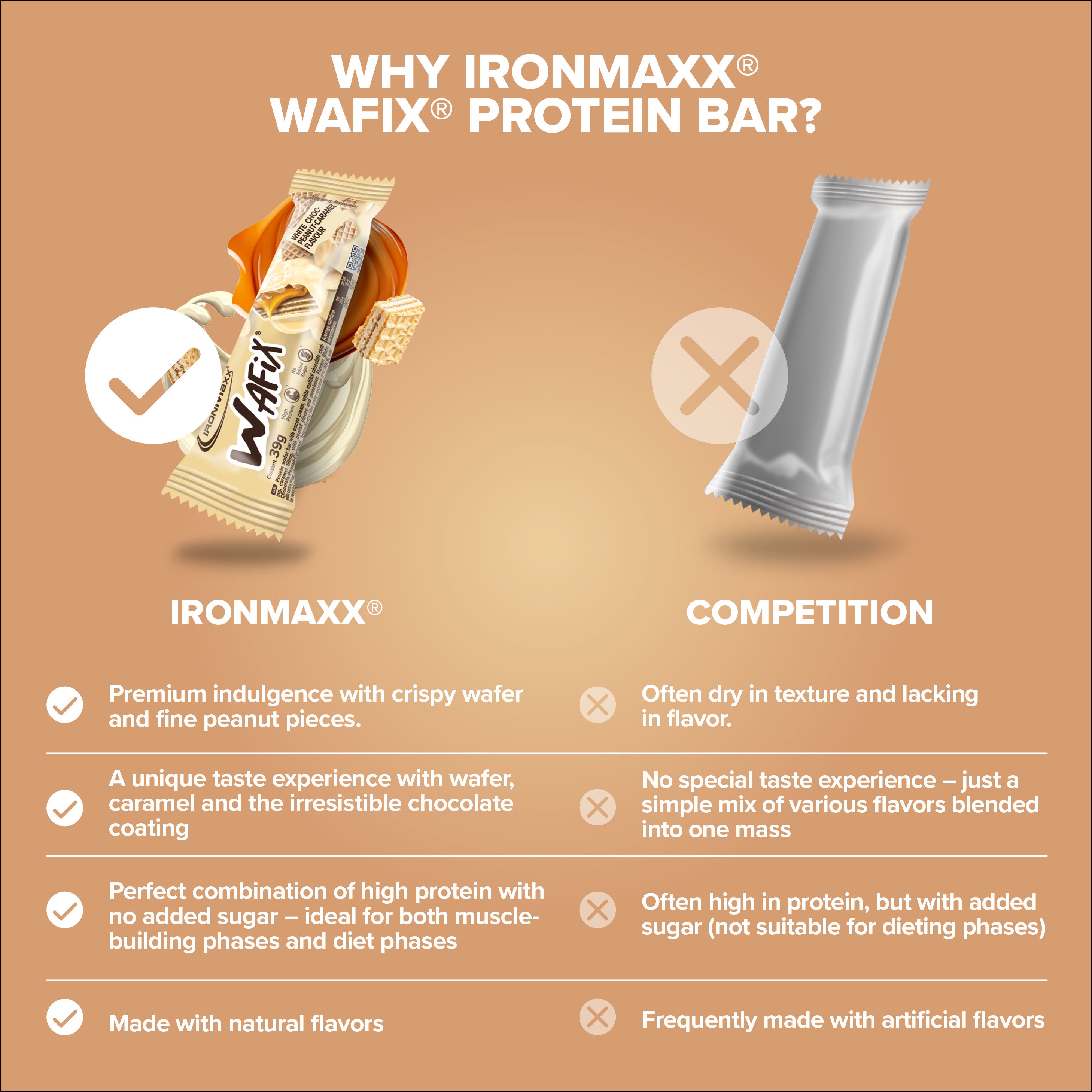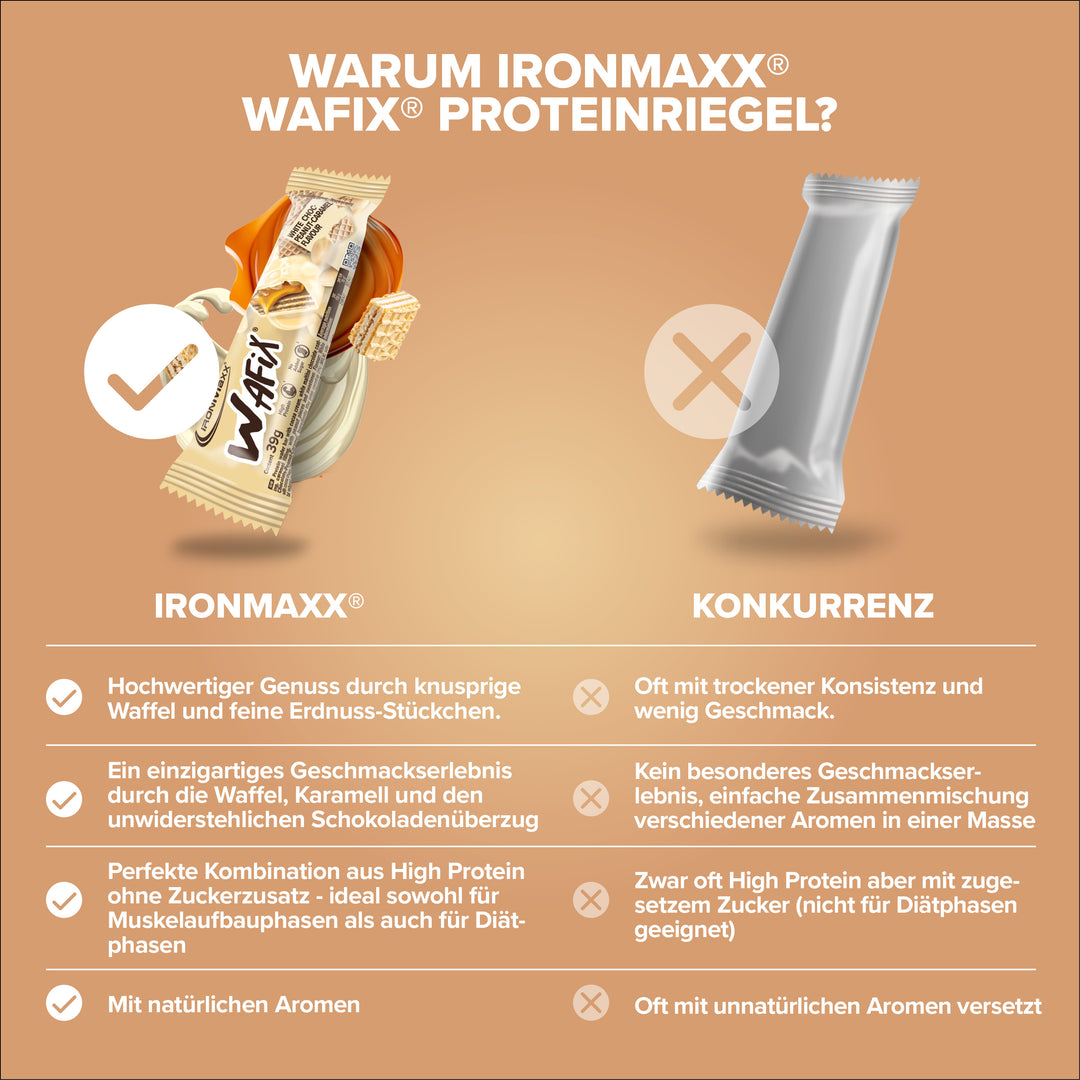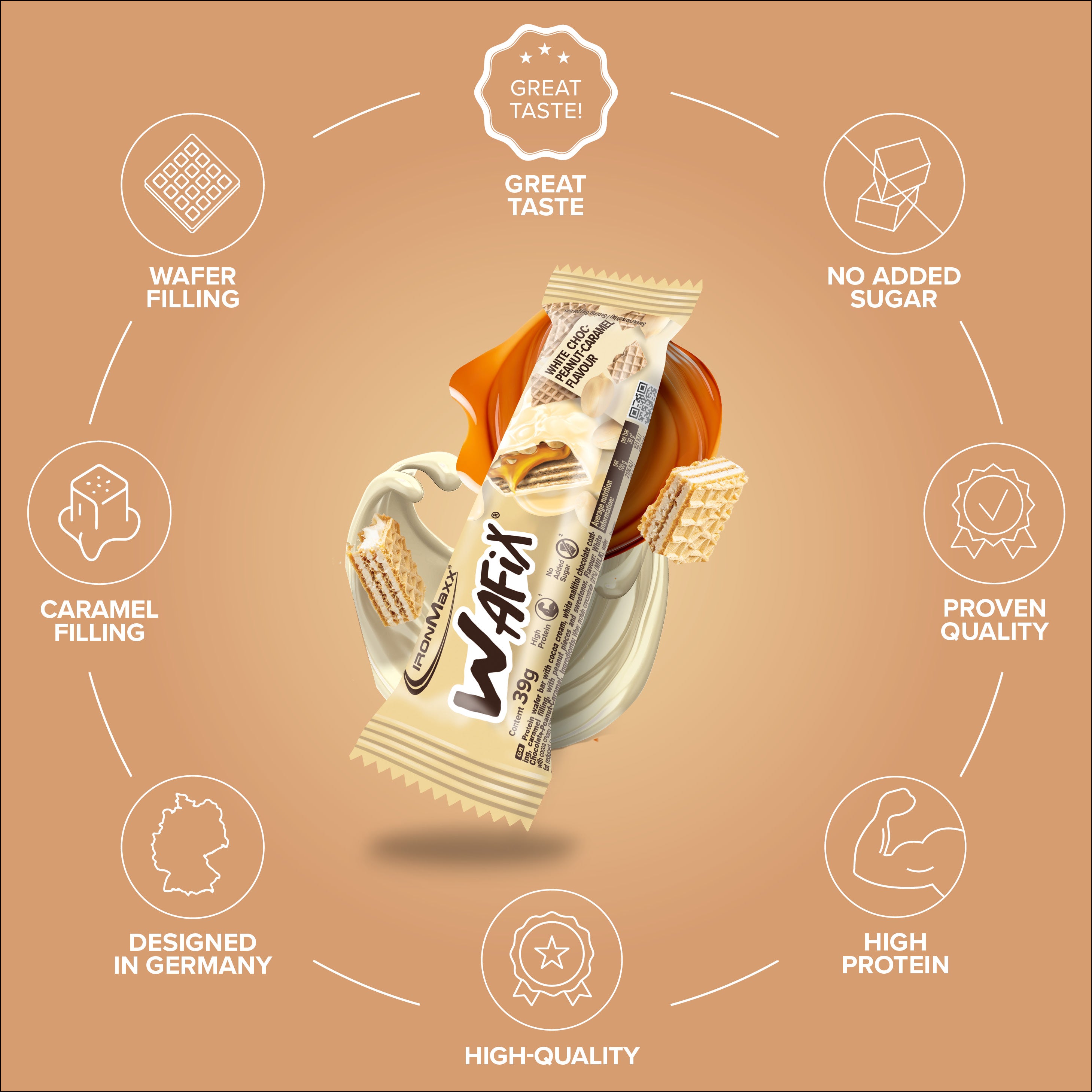 Der IronMaxx® Wafix vereint knusprige Waffelschichten, cremige Karamellfüllung, feine Kakaocreme und knackige Erdnussstückchen zu einem einzigartigen Snack-Erlebnis. Jeder Riegel (39 g) liefert 10 g hochwertiges Protein und unterstützt so Muskelaufbau und Erhalt.