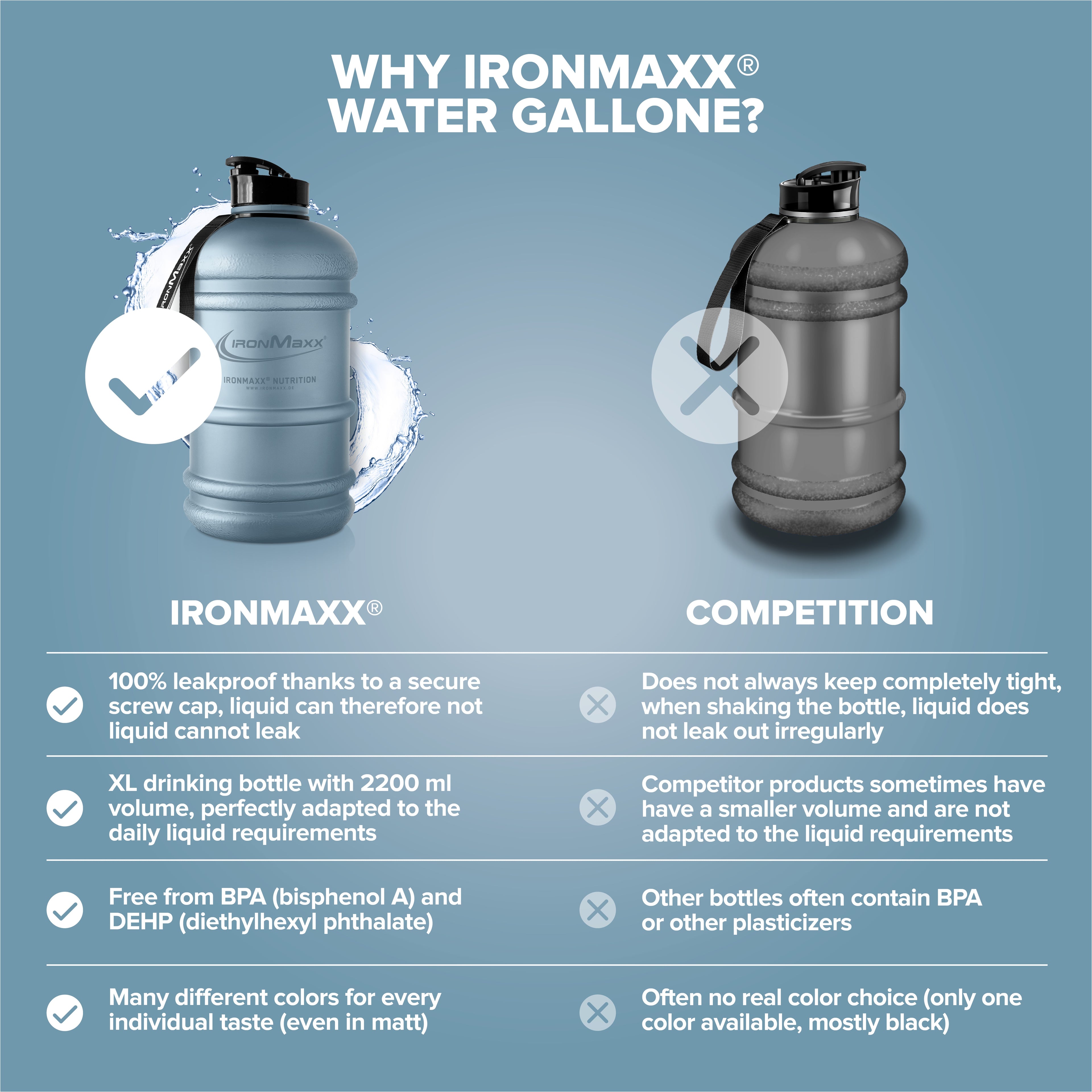 - Dein Hydration-Booster: Die Water Gallon von IronMaxx® ist der perfekte Motivator, um ausreichend Flüssigkeit zu trinken – ob beim Training oder im Alltag.