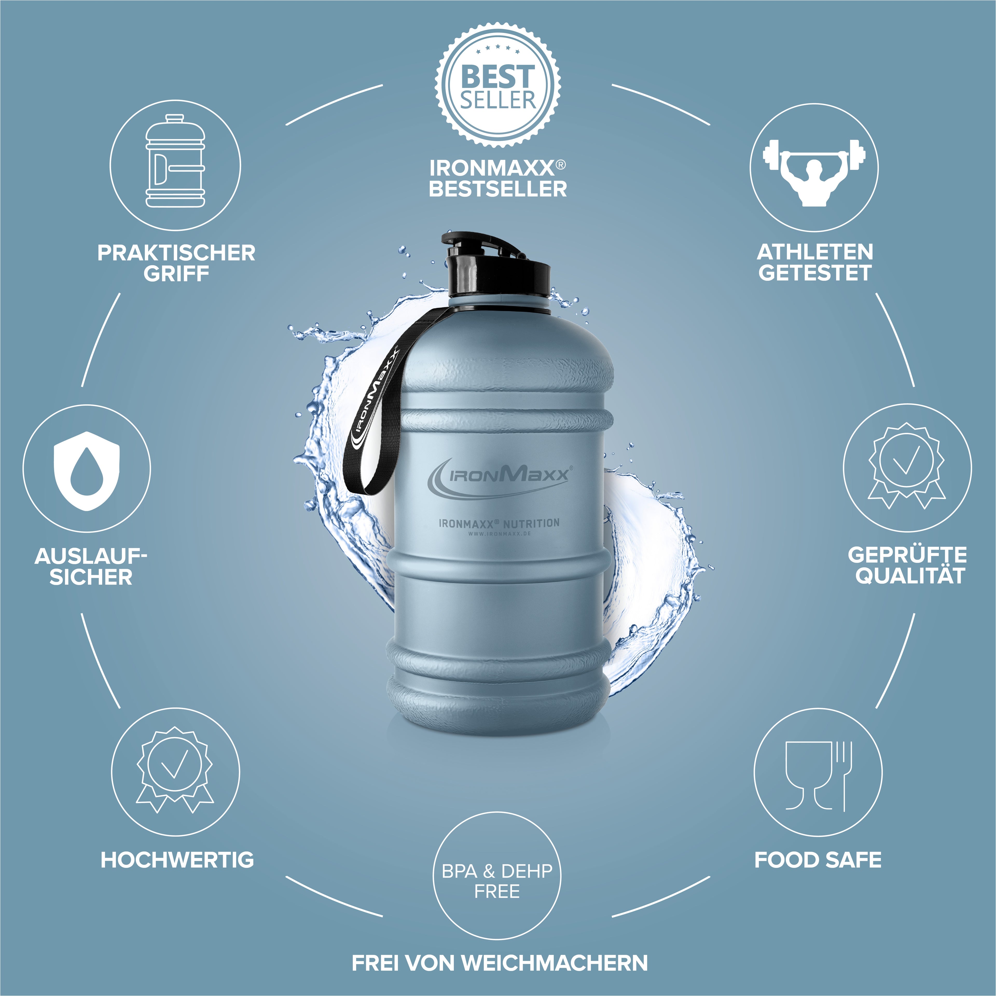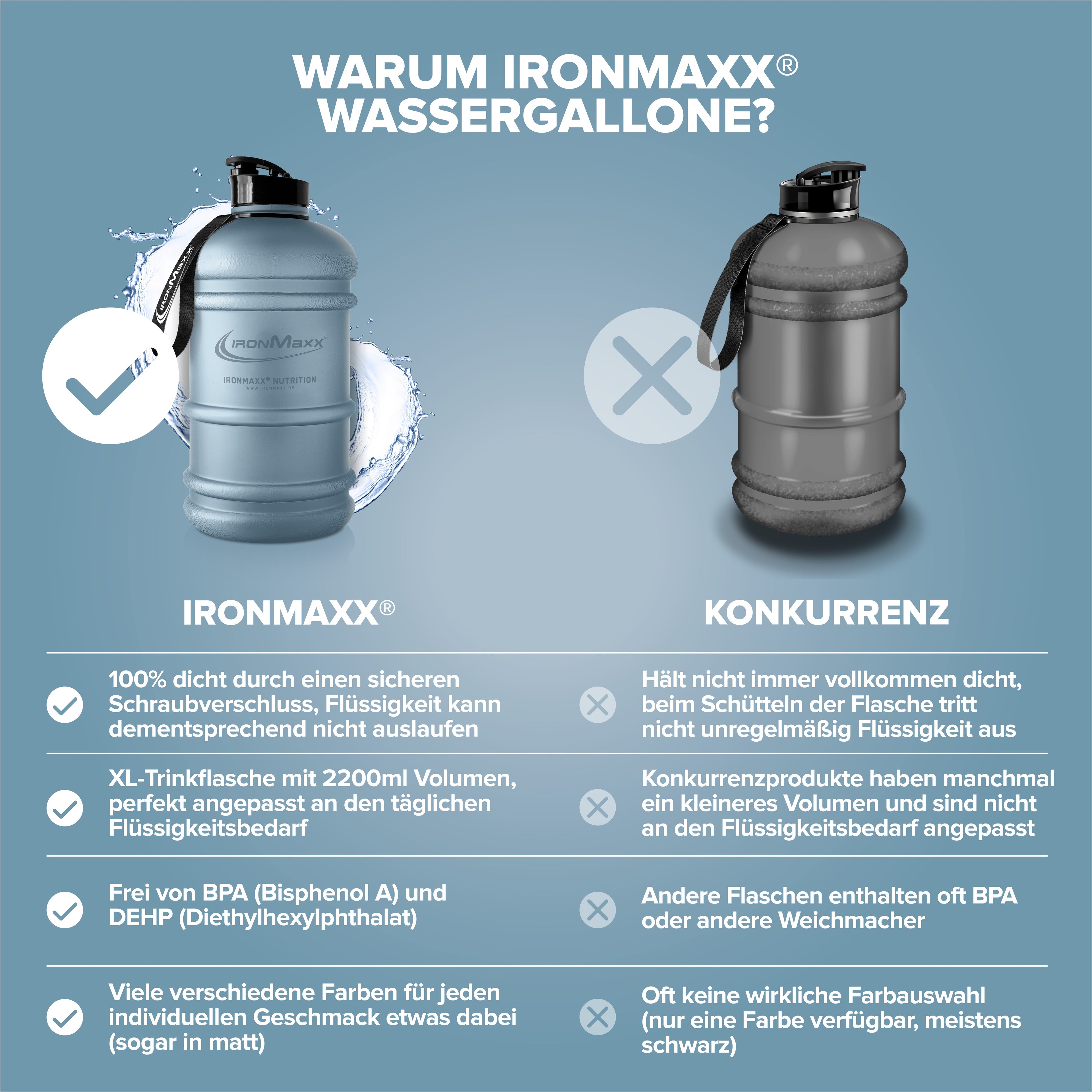 Vergisst du oft, genug Wasser zu trinken? Dann ist die IronMaxx® Water Gallon dein perfekter Begleiter im Alltag. Mit einem Fassungsvermögen von 2,2 Litern hilft dir diese stylische XL-Trinkflasche, deinen Flüssigkeitshaushalt optimal zu decken – egal ob im Gym, im Büro oder unterwegs.