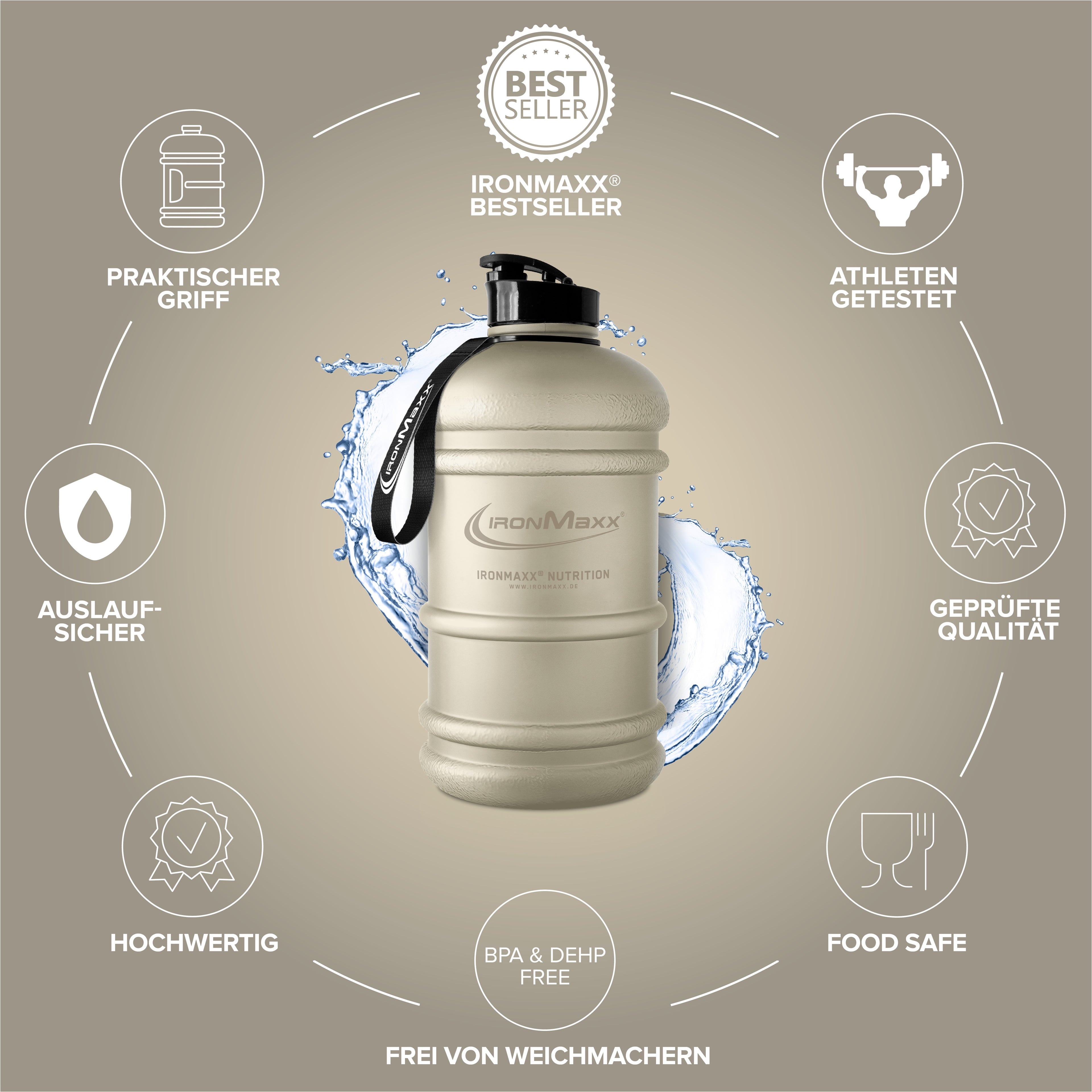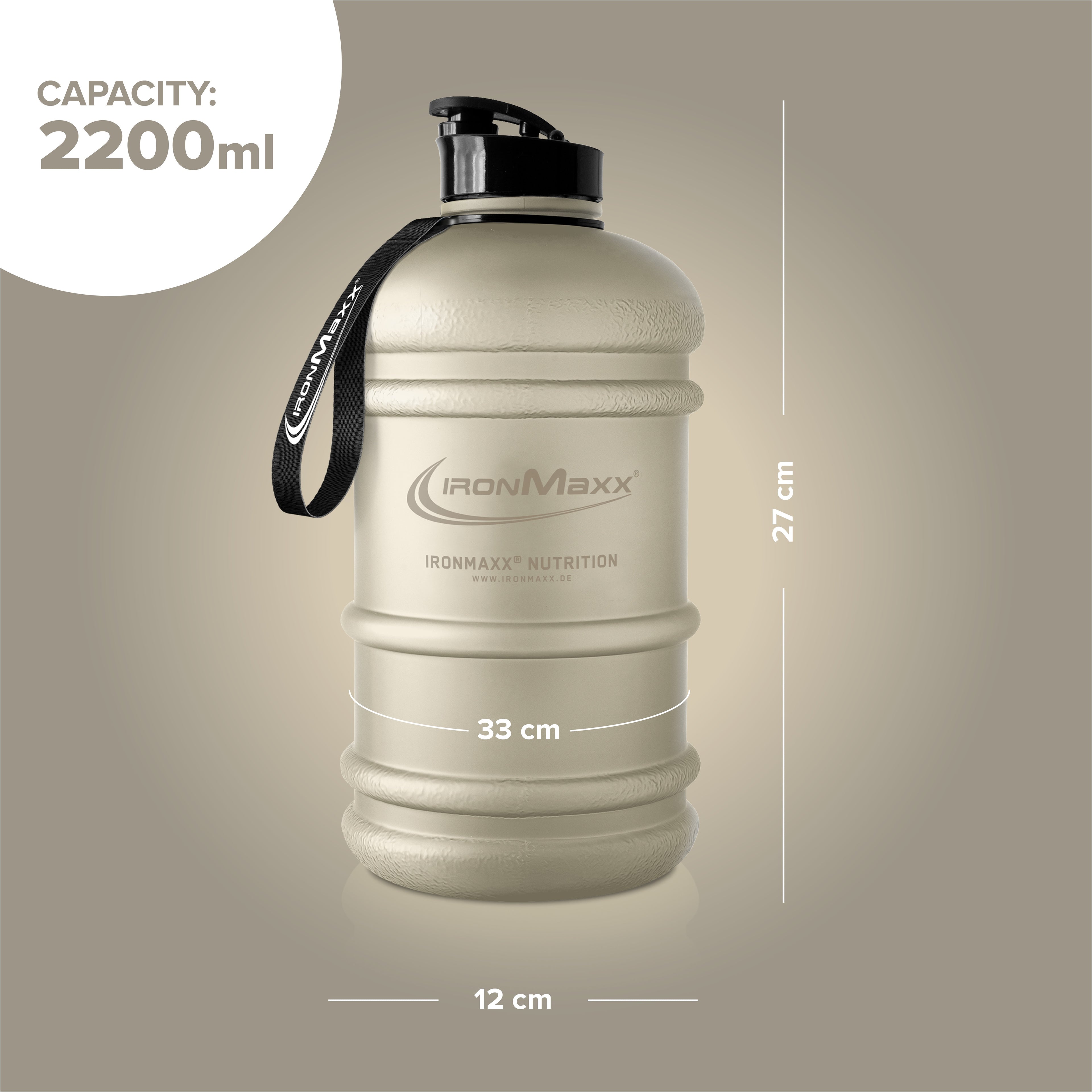 Vergisst du oft, genug Wasser zu trinken? Dann ist die IronMaxx® Water Gallon im Matt Sandstone Beige dein neuer bester Begleiter! Mit einem Fassungsvermögen von 2,2 Litern unterstützt dich diese stylische XL-Trinkflasche dabei, deinen Flüssigkeitshaushalt über den Tag hinweg optimal zu decken – egal ob im Gym, im Büro oder unterwegs. Dank praktischer Handschlaufe, griffigem Henkel und Milliliter-Skala behältst du jederzeit den Überblick.