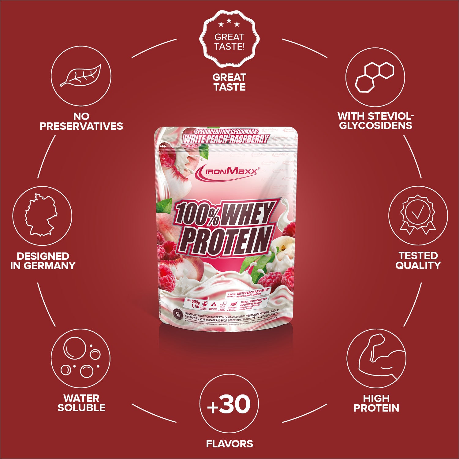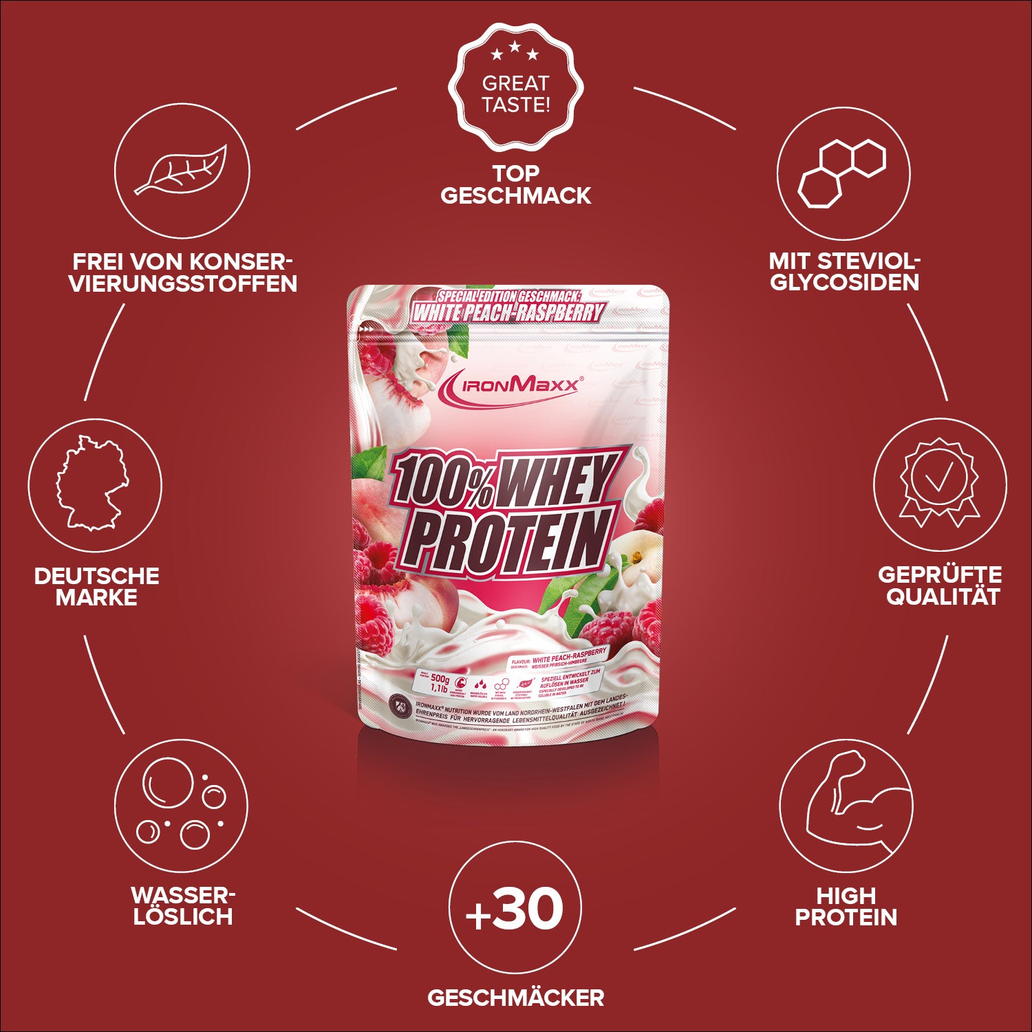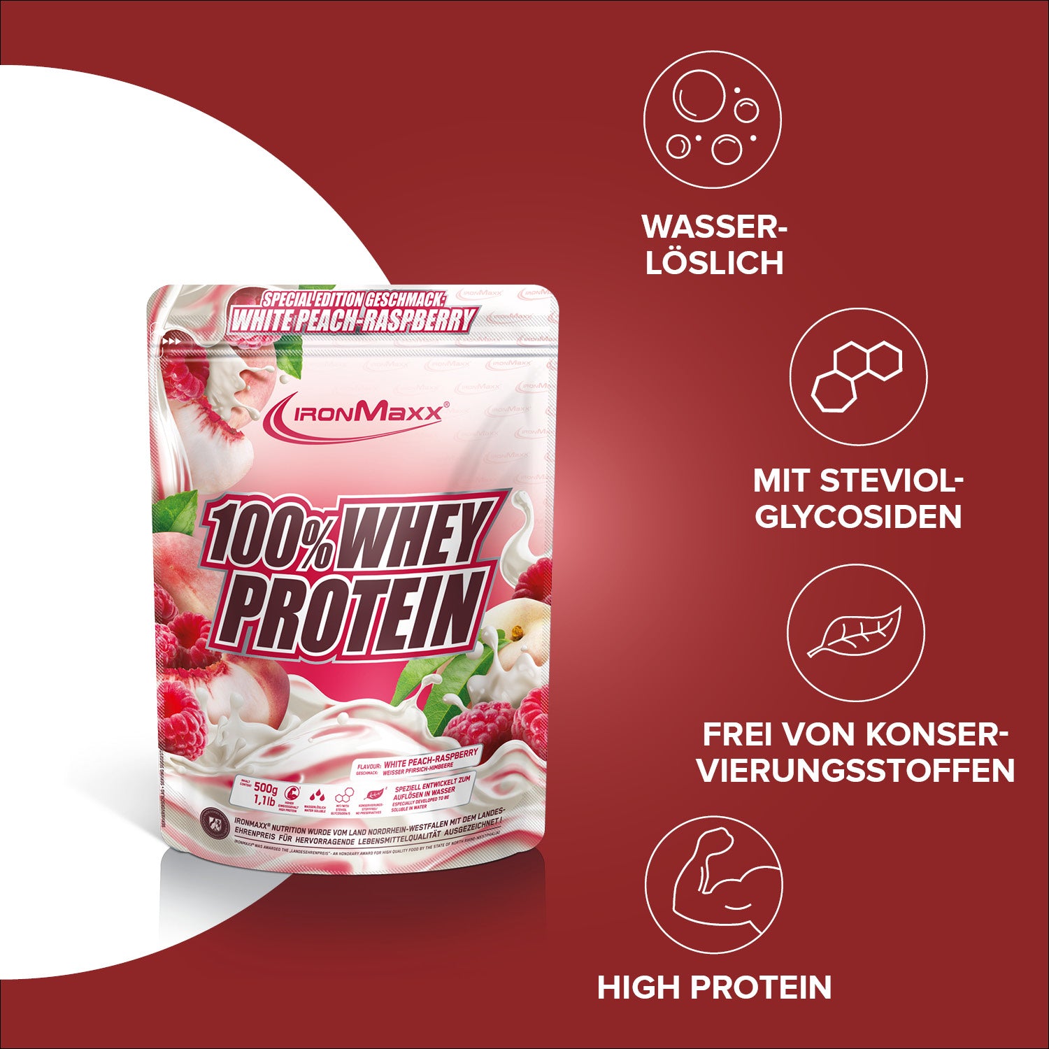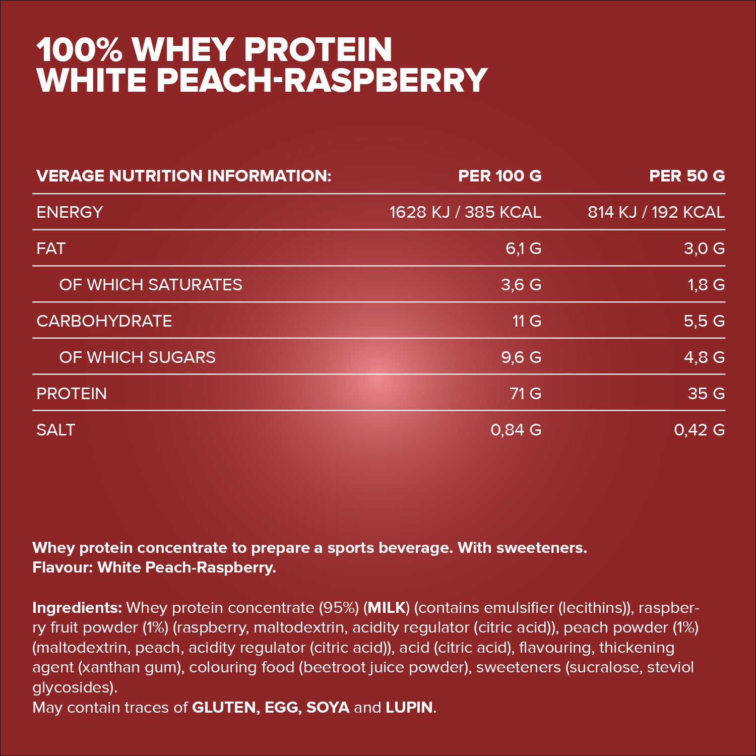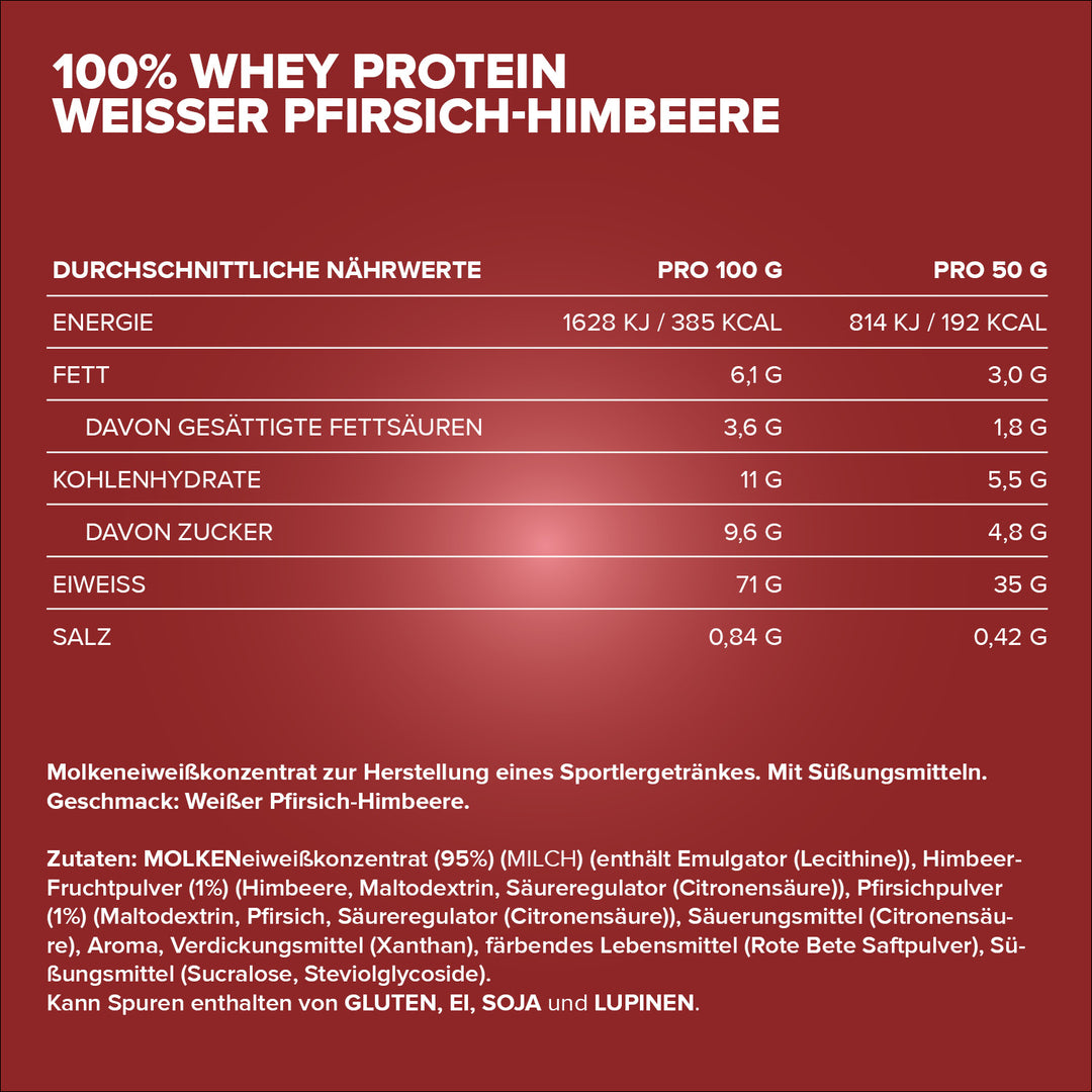 Verkehrsbezeichnung: Molkeneiweißkonzentrat zur Herstellung eines Sportlergetränks. Mit Süßungsmitteln. Geschmack: Weißer Pfirsich-Himbeere.
