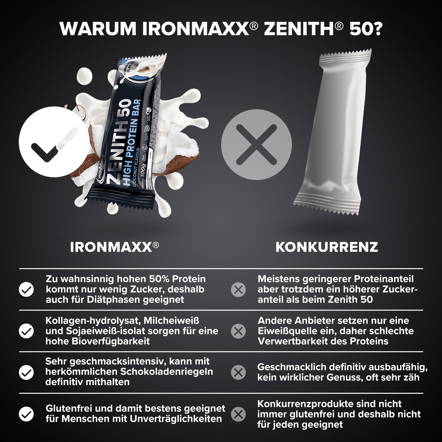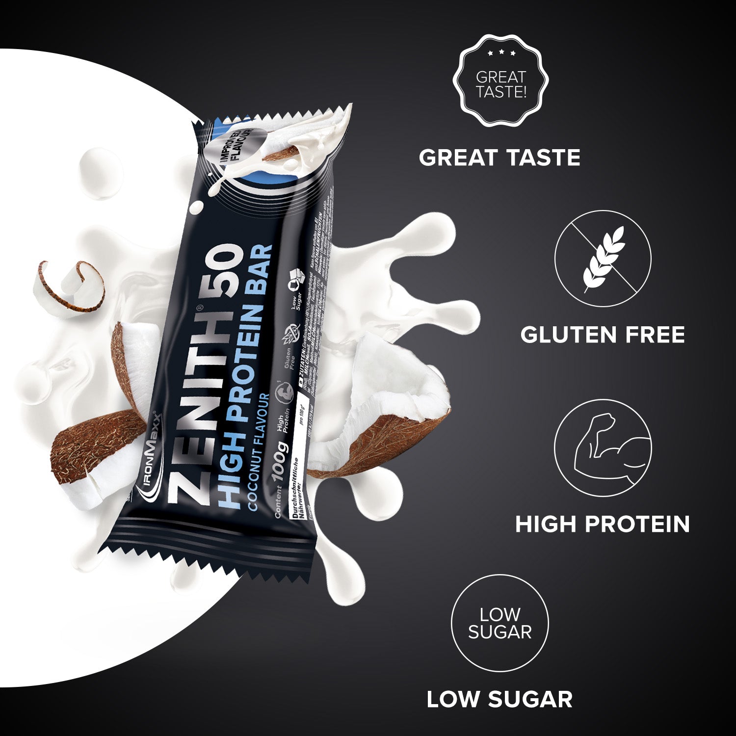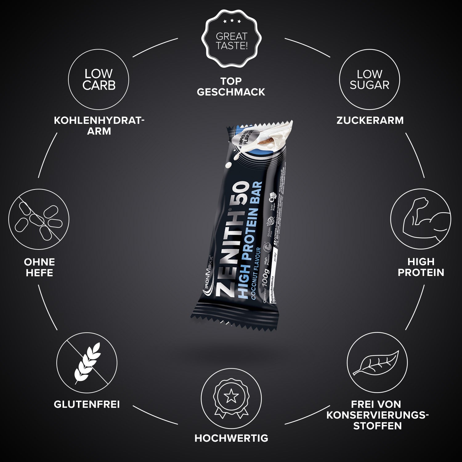 - High Protein Riegel: Der ZENITH® 50 High Protein Bar von IronMaxx® überzeugt mit 50 % Eiweiß – der höchste Proteingehalt in unserem Sortiment.