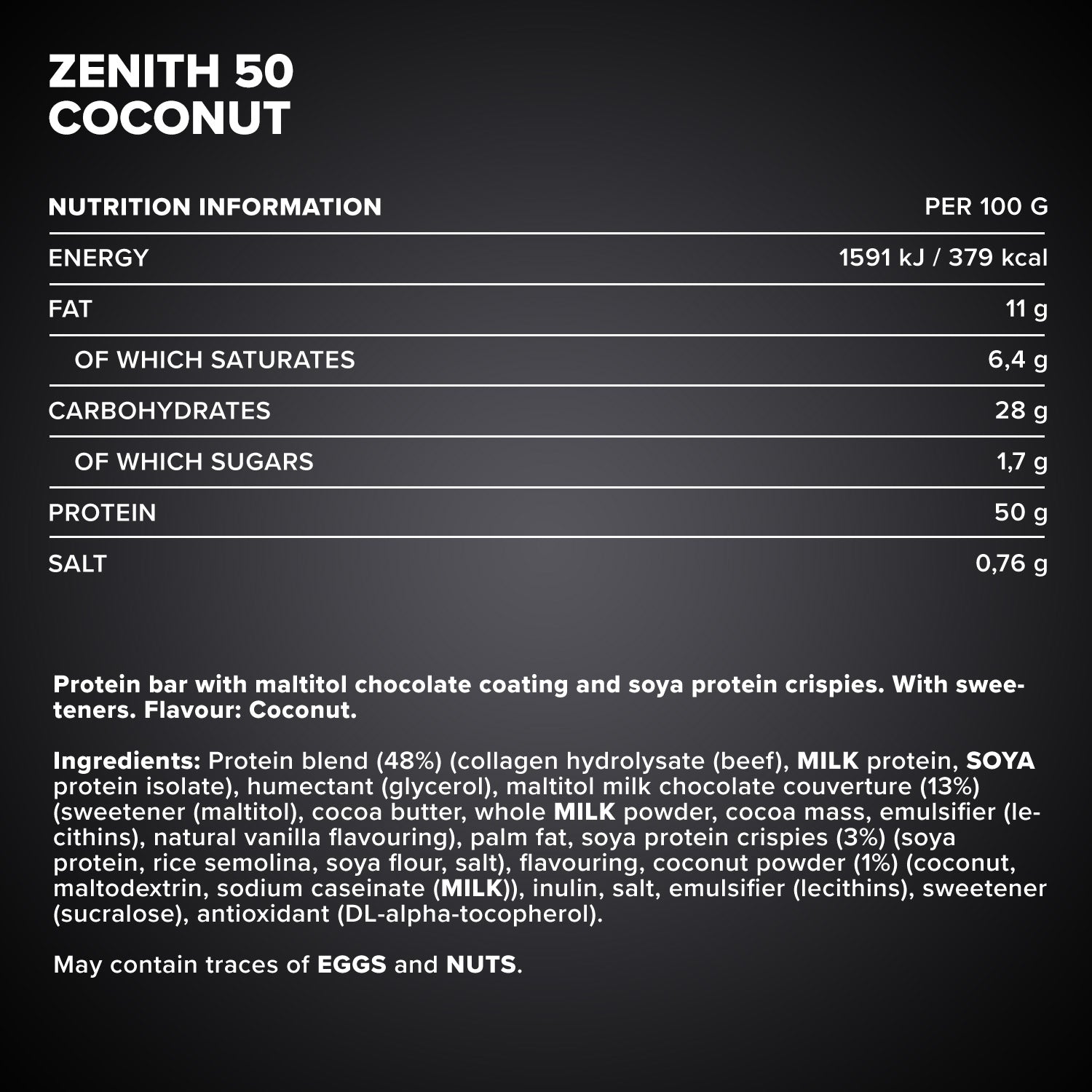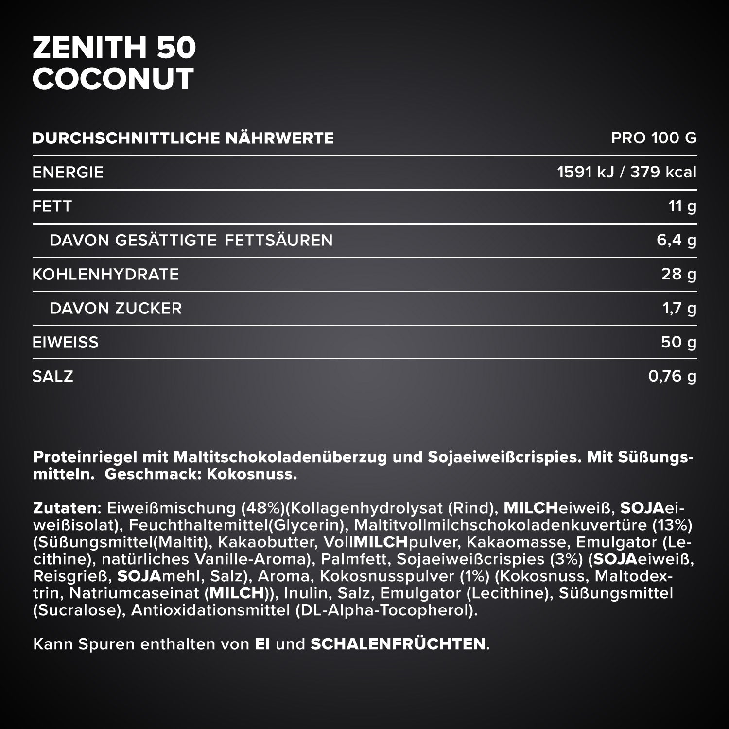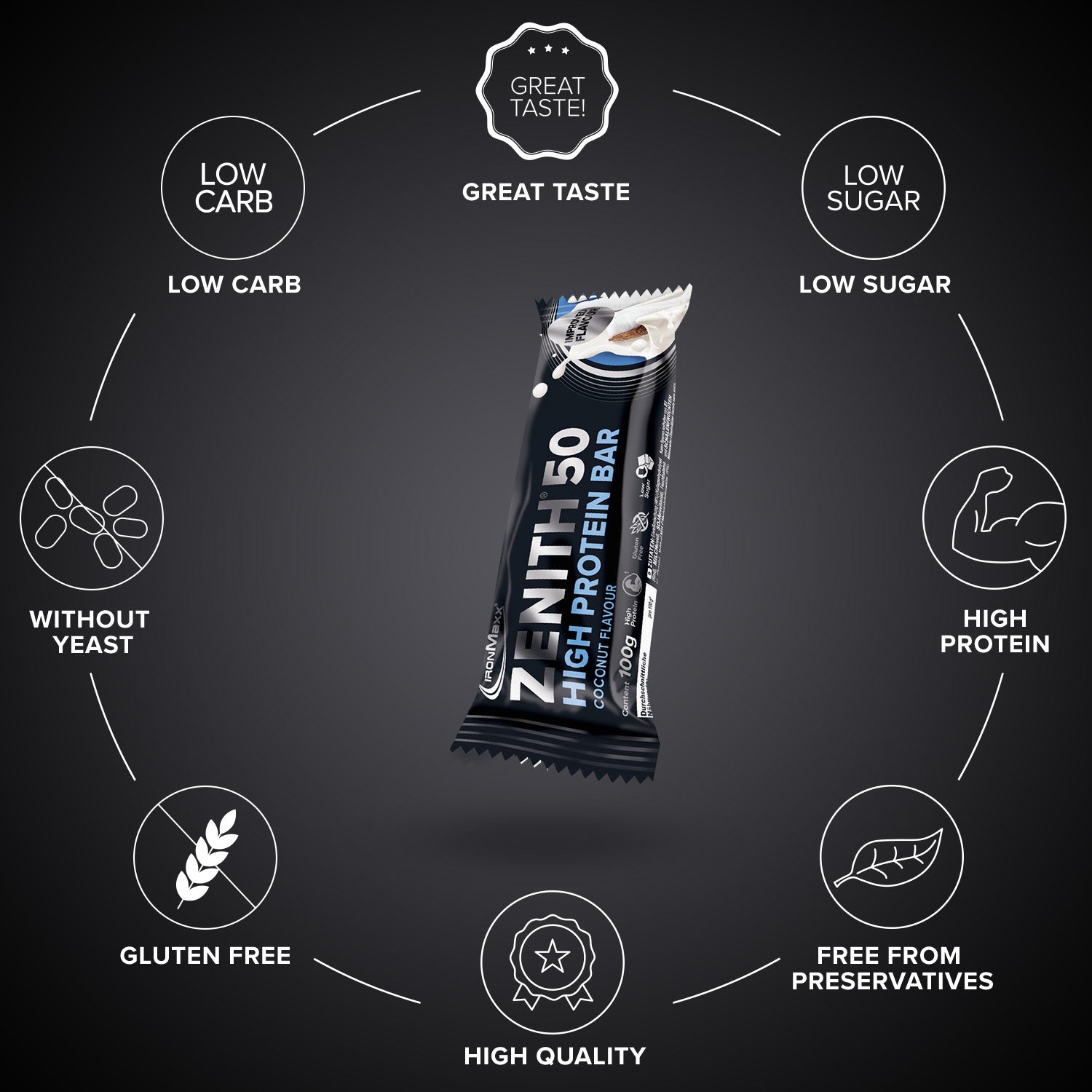 - High Protein Riegel: Der ZENITH® 50 High Protein Bar von IronMaxx® überzeugt mit 50 % Eiweiß – der höchste Proteingehalt in unserem Sortiment.