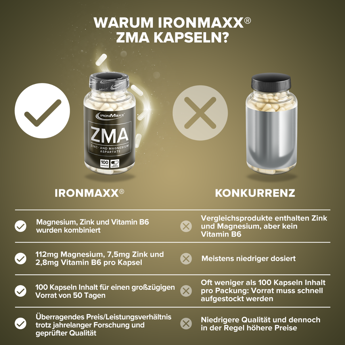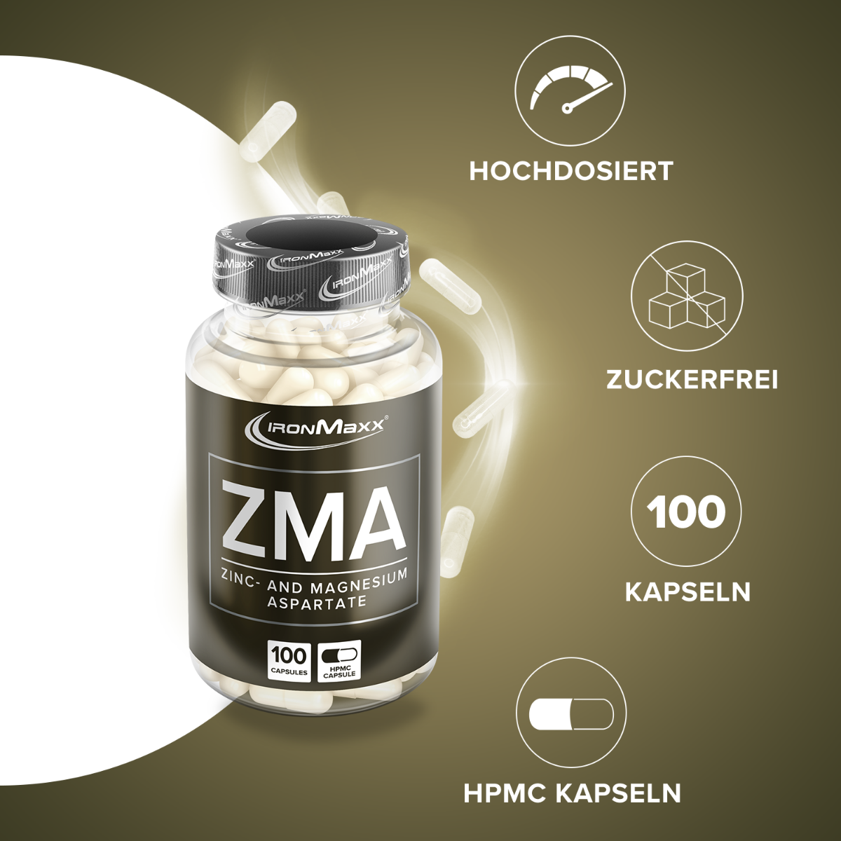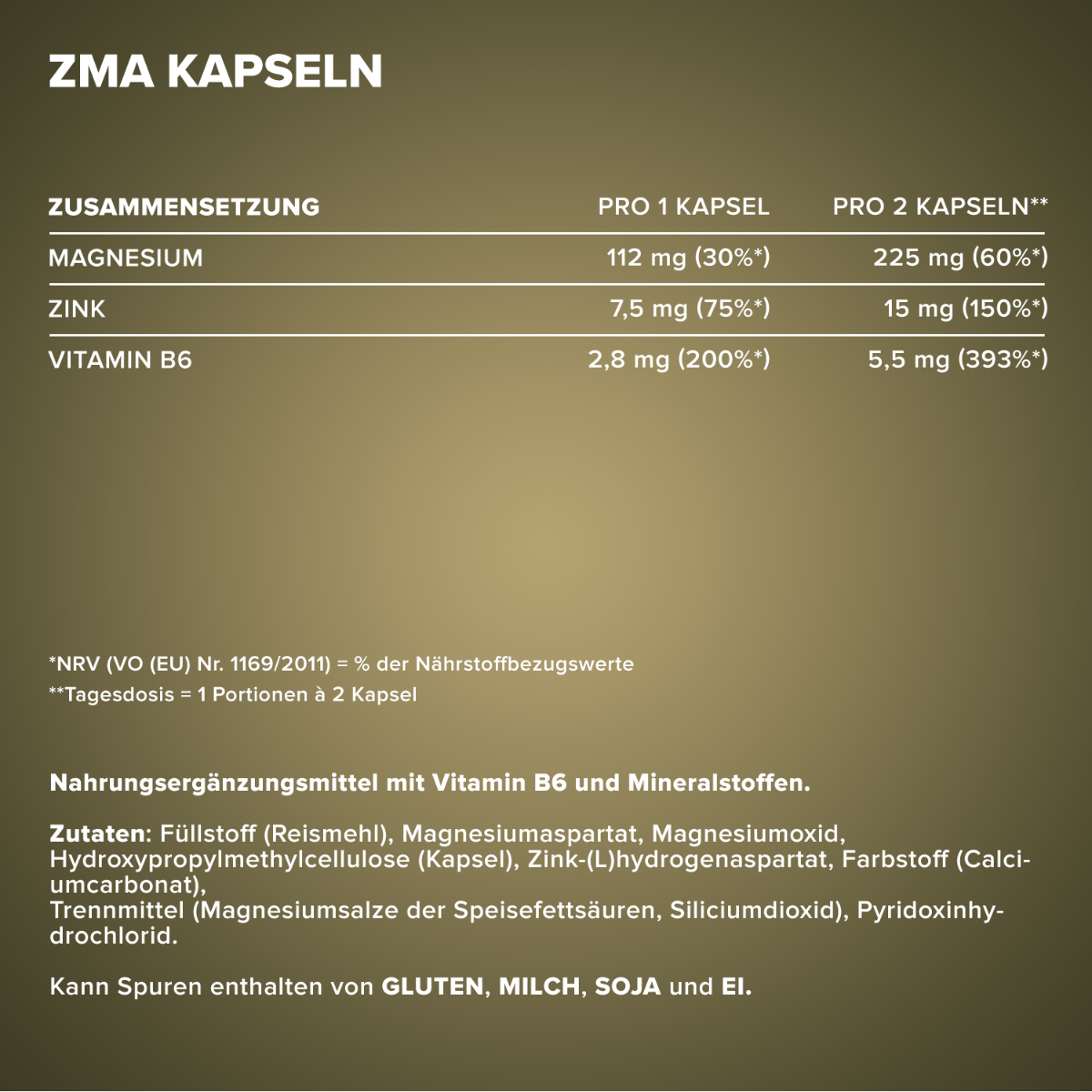 Die ZMA-Kapseln von IronMaxx® kombinieren Magnesium, Zink und Vitamin B6 in hochverfügbarer Form – für gezielte Unterstützung deiner Muskelfunktion, Eiweißsynthese und Regeneration. Pro Tagesportion (2 Kapseln) erhältst du 225 mg Magnesium, 15 mg Zink und 5,5 mg Vitamin B6. Zink trägt zur Erhaltung eines normalen Testosteronspiegels bei, während Magnesium zur Verringerung von Müdigkeit beiträgt. Perfekt dosiert und ideal für Sportler, die auf bewährte Mikronährstoff-Kombinationen setzen.