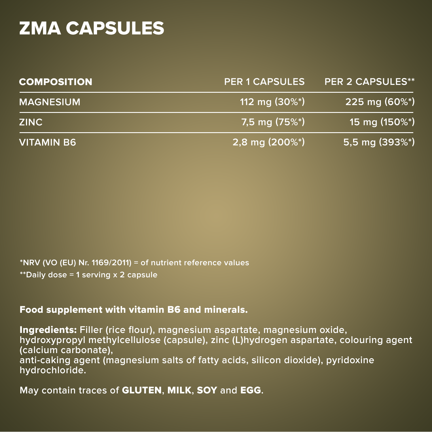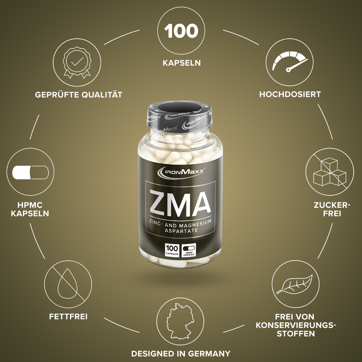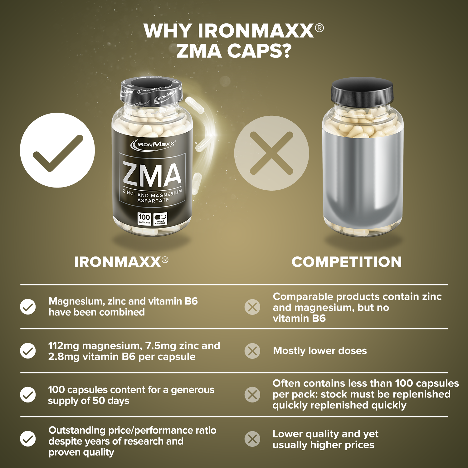 Die ZMA-Kapseln von IronMaxx® kombinieren Magnesium, Zink und Vitamin B6 in hochverfügbarer Form – für gezielte Unterstützung deiner Muskelfunktion, Eiweißsynthese und Regeneration. Pro Tagesportion (2 Kapseln) erhältst du 225 mg Magnesium, 15 mg Zink und 5,5 mg Vitamin B6. Zink trägt zur Erhaltung eines normalen Testosteronspiegels bei, während Magnesium zur Verringerung von Müdigkeit beiträgt. Perfekt dosiert und ideal für Sportler, die auf bewährte Mikronährstoff-Kombinationen setzen.